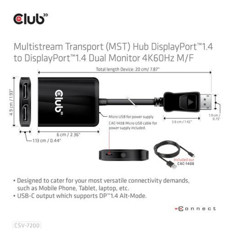 CLUB3D Multistream Transport (MST) Hub DisplayPort™1.4 to DisplayPort™1.4 Dual Monitor 4K60Hz M/F