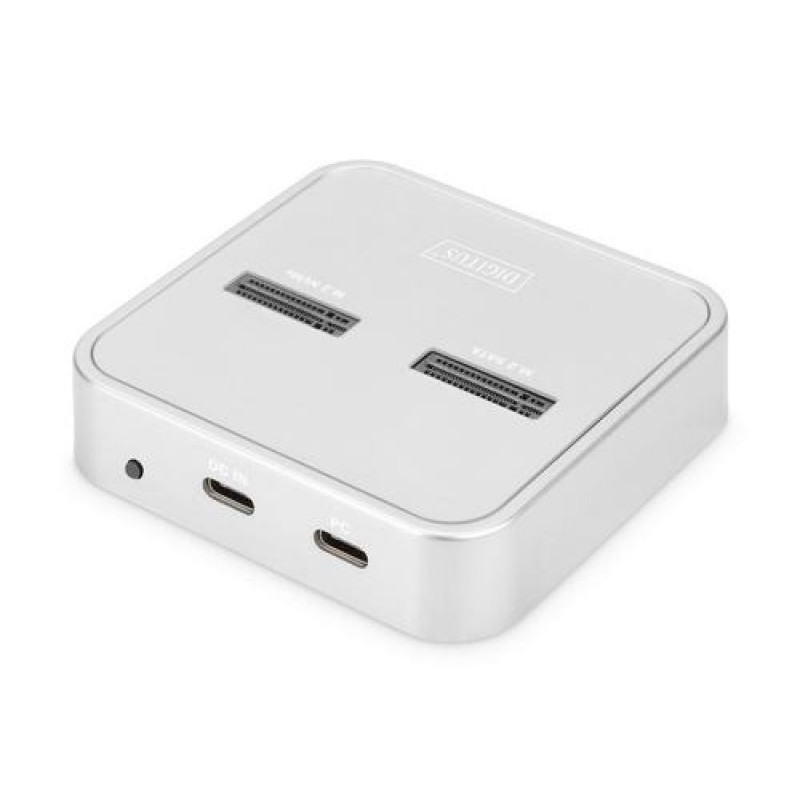 Manage M.2 NVMe and M.2 SATA SSDs using a USB-C™ connection, incl. integrated SD Express card reader<br><br>- 1 x M.2 Box for NVMe SSDs (B+M-Key / M-Key)<br>- 1 x M.2 Box for SATA SSDs (B+M-Key)<br>- 1 x SD Express 7.1 memory card reader / 1000 MB/s max.<br>- High data transfer rate of up to 10 Gbps (U.A.S.P + T.R.I.M support)<br>- Supports cards NVMe & SATA SSDs up to 4 TB capacity<br>- Supported formats: 2242, 2260, 2280 & 22110<br>- Can be used as a storage medium for up to 10 TB in total<br>- USB-C™ connection: USB 3.2 Gen2<br>- Ideal storage extension for notebooks, PCs, gaming consoles, TVs, NAS or routers (USB-C™)<br>- Plug and Play, no driver installation required<br><br>The 3-in-1 Docking Station from DIGITUS® can accommodate M.2 SSDs in NVMe or SATA technology; an SD Express 7.1 card reader with the highest data transfer rates is also integrated. Manage M.2 data carriers with up to 4 TB per slot and additionally SD cards up to 2 TB. Supports NVMe SSDs with B+M Key & M-Key and SATA SSDs with B+M-Key, each in the formats 2242, 2260, 2280 & 22110. Easily extend the storage capacity of numerous USB-C™ devices such as PCs, notebooks, TVs, gaming consoles or routers.Digitus M.2 NVMe + M.2 SATA SSD Docking Station with SD Express Card Reader, USB-C™. Connectivity technology: Wired, Host interface: USB 3.2 Gen 2 (3.1 Gen 2) Type-C. Product colour: Silver, Compatible memory cards: SD, Maximum memory card size: 2 TB. Power source type: USB, Power connector: USB Type-C, AC input voltage: 100 - 240 V. Windows operating systems supported: Windows 10, Windows 7, Windows 8, Windows 8.1, Windows XP, Mac operating systems supported: Mac OS X 10.0 Cheetah, Mac OS X 10.1 Puma, Mac OS X 10.10 Yosemite, Mac OS X 10.11 El Capitan, Mac.... Width: 79 mm, Depth: 77 mm, Height: 18 mm
