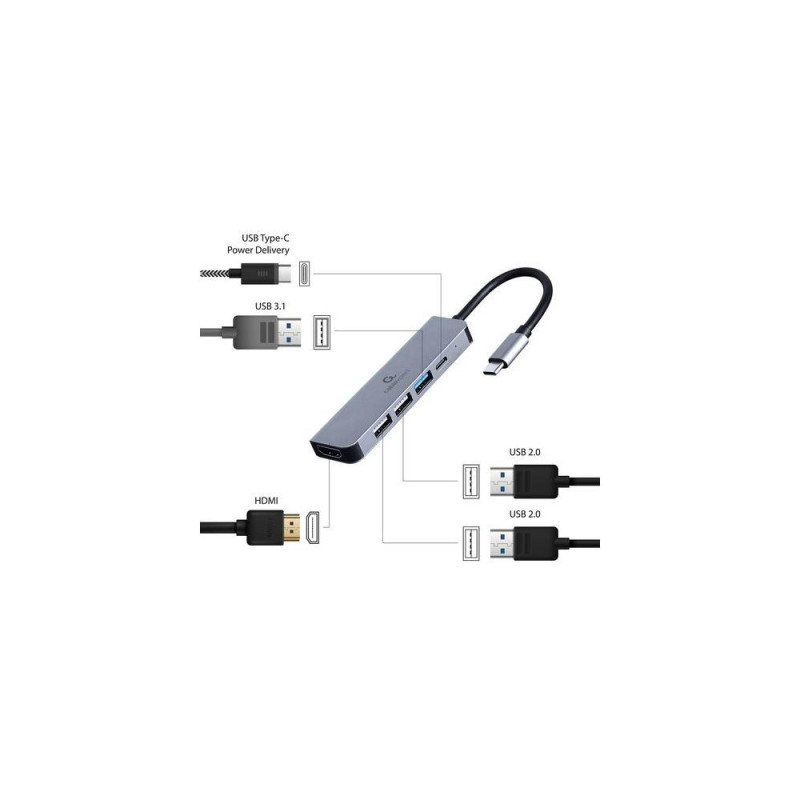 5-in-1 multi-port adapter with integrated type-C cable<br>HDMI port with UHD 4K support<br>1x USB 3.1 (Gen 1) port with SuperSpeed, 5 Gbit/s data transfer rates<br>2x USB 2.0 ports<br>87 W USB Type-C Power Delivery port<br>Gembird A-CM-COMBO5-03. Connectivity technology: Wired, Host interface: USB 3.2 Gen 1 (3.1 Gen 1) Type-C, USB Power Delivery up to: 87 W. Product colour: Silver, Data transfer rate: 5 Gbit/s, Maximum digital resolution: 3840 x 2160 pixels. USB cable length: 0.12 m. Width: 28 mm, Depth: 102 mm, Height: 10 mm. Package width: 75 mm, Package depth: 138 mm, Package height: 19 mm