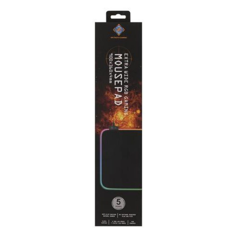 Gaming mouse pad with RGB lighting on the sides. The upper part is made of comfortable fabric for a soft and precise movement with your mouse. The RGB lighting controls with a single button in the top left corner that switches between the different lighting modes. No software is needed but the lighting is completely plug and play, the carpet is connected to your computer or a USB power source (5V 100mA at least) via the 1.5m supplied USB-A - Micro-B cable. At the bottom of the mouse pad you will find natural rubber to keep the mouse pad securely in place.Deltaco GAM-079. Width: 900 mm, Depth: 360 mm. Product colour: Black, Surface coloration: Monochromatic, Material: Fabric, USB powered, Backlight colour: Red/Green/Blue