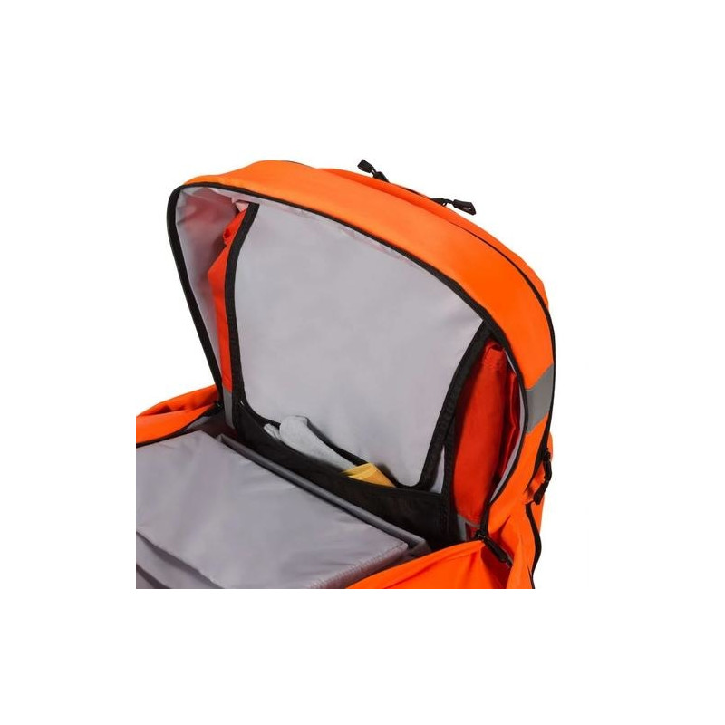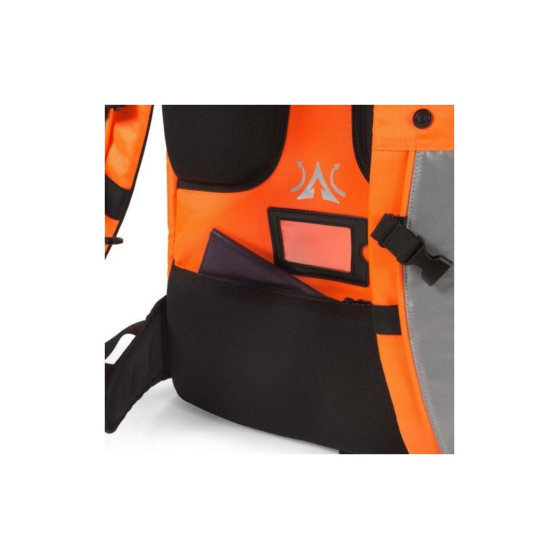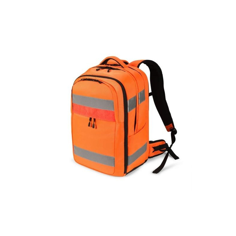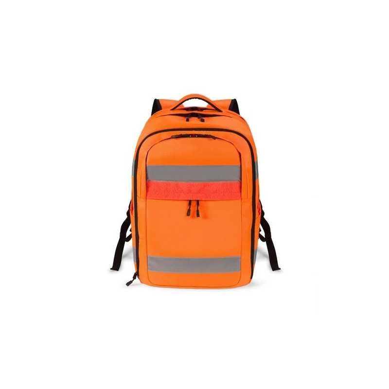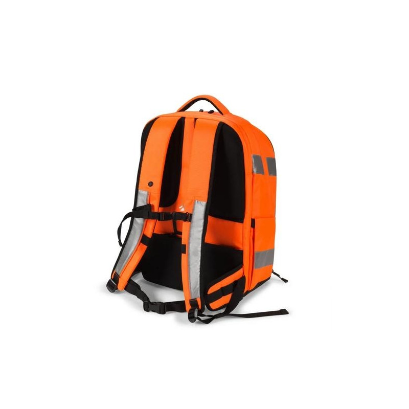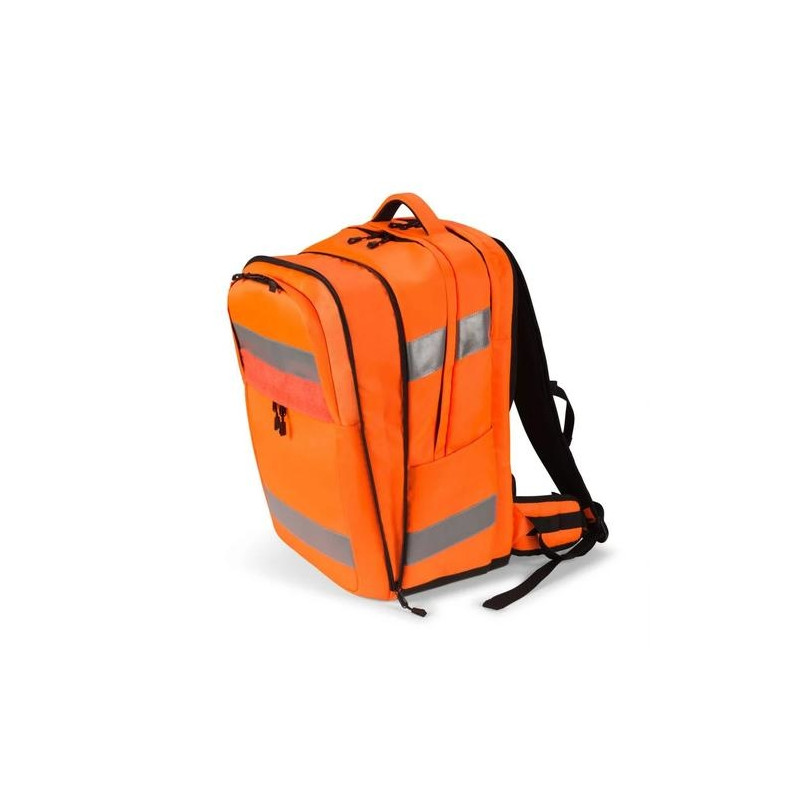 Safety at work comes first -accidents can be avoided with the right equipment. The EN ISO 20471:2013 standard guarantees optimal visibility for employees in work clothing. You can also safely and conveniently transport work equipment such as spare clothing, helmets, gloves and personal items for outdoor jobs that span several days. <br><br>With its high-visibility backpacks, DICOTA offers a reliable solution for challenging work days outdoors. All products meet important procurement criteria, including ergonomics, durability and sustainability. The highest level of quality and functionality meets sustainable materials made from recycled PET bottles -protecting both employees and the environment. The use of fluorescent fabrics and 3M reflective strips in line with EN ISO 20471:2013 means the backpacks offer excellent visibility, thus improving safety at work in outdoor areas like construction sites and forests and for rescue operations as well as on the way to work. The outer material is water-repellent, certified under EN ISO 4920, Level 4, and the rain cover supplied provides additional protection for heavy downpours. The air-flow system on the back guarantees pleasant air circulation when temperatures rise. The adjustable hip and chest straps ensure comfortable weight distribution and the best ergonomics. With plenty of storage space, the backpack is perfectly designed for outdoor use. It can be expanded from 32 to 38 litres, so offers plenty of room for a change of clothes or work clothes. These can be stored separately from the rest of the contents. The notebook is fully protected with the tried-and-tested fit-all system. There are also compartments for tablet, smartphone, power bank, torch, etc., as well as universal zipped compartments. Valuables can be safely stored in the compartment on the back to prevent theft. A business card pocket and the Velcro area on the back allow you to personalise the backpack with a name or logo patch. The backpack Hi-Vis 32 -38 litres offers maximum space, comfort and visibility and is perfect for a demanding day working outdoors. It also improves safety at work while helping to prevent accidents.DICOTA Hi-Vis. Product main colour: Orange, Style: City, Coloration: Monochromatic. Certification: EN ISO 20471:2013, EN ISO 4920, Level 4. Width: 360 mm, Depth: 260 mm, Height: 520 mm. Material: Polyethylene terephthalate (PET), Thermoplastic polyurethane (TPU)