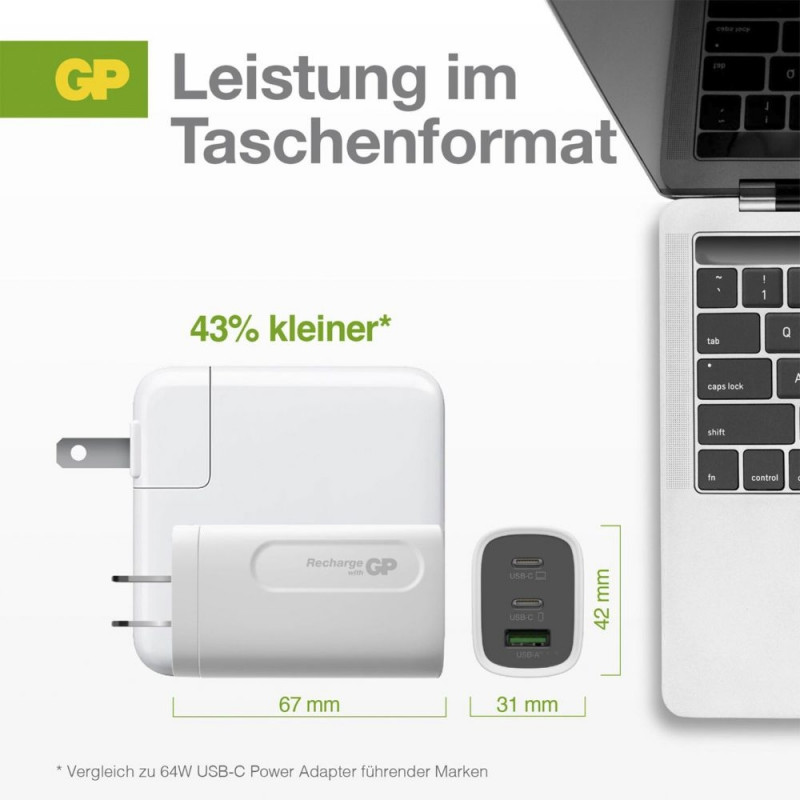 GP GaN PD 65 W -verkkovirtalaturi, 2x USB-C + 1x USB-A, valkoinen