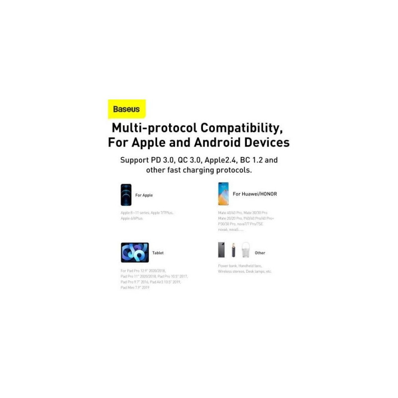 Baseus charger is a very useful product. Quick charging is one of its main strong points. Inside the product you can find a chip whose main role is to make sure your devices never overcharge. A small and handy size of the charger will let you take it with you anywhere you go.