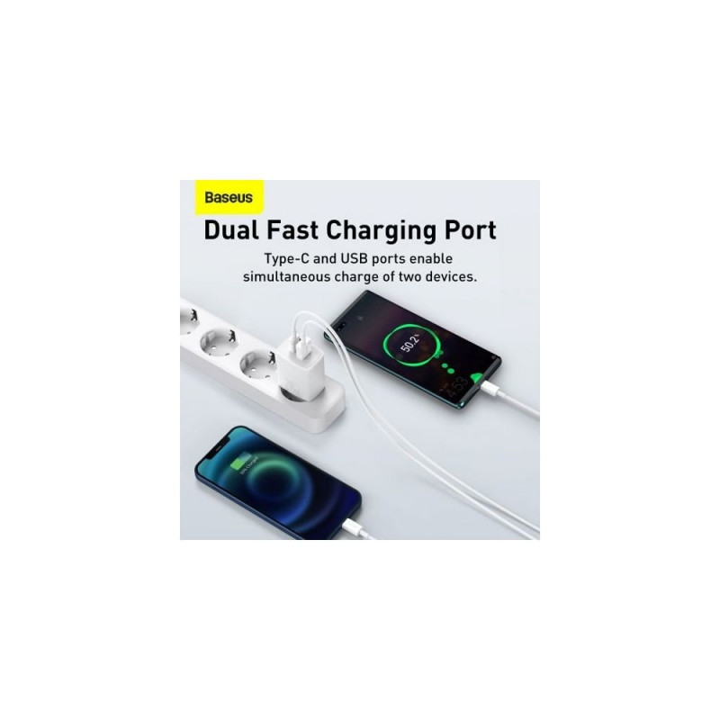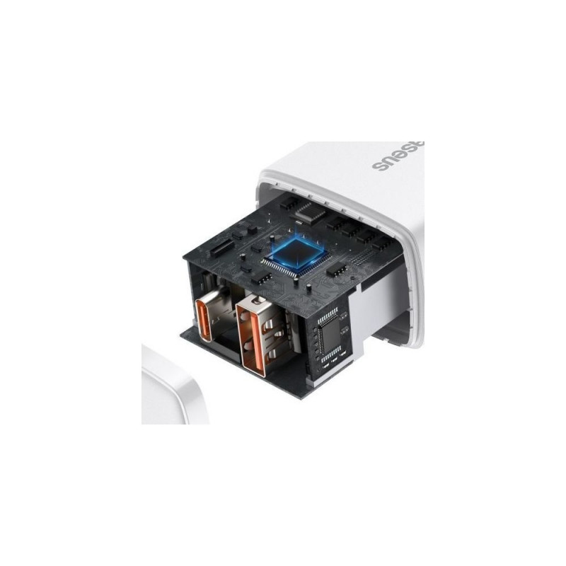 Thanks to Baseus charger, you no longer need to carry two charges. It is attributable to the special design. The upper part of the plug holds two USB ports, one type C and the other type A. Based on this solution, you can resign from two independent chargers and choose one, which is substantially more useful and takes less space in a handbag or backpack. Another advantage of this offer is possibility of charging two devices at a time with the use of one socket.
