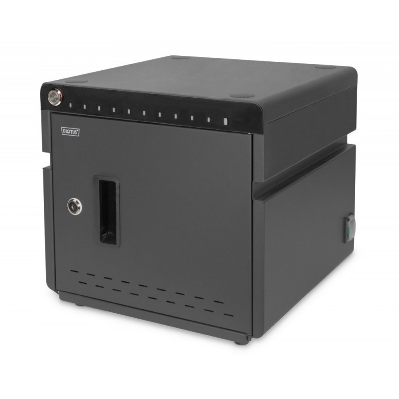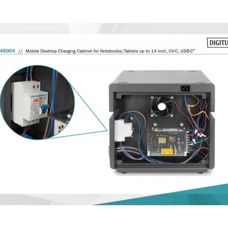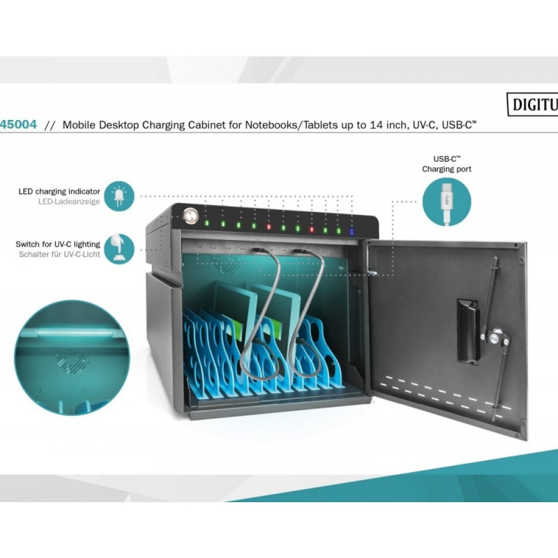 DIGITUS mobiilne laadimiskapp on ideaalne ja kompaktne lahendus mobiilseadmete, nagu sülearvutid ja tahvelarvutid, hoiustamiseks ja laadimiseks. Mobiilsed laadimiskapid on sageli kasutusel avalikes asutustes, näiteks koolides, et hoida seadmeid turvaliselt ühes kohas ja samal ajal neid laadida. Kapis on 10 laadimisriiulit, millest igaühel on esiküljel oma USB-port. Tänu integreeritud LED-tuledele saate pidevalt jälgida laadimisprotsessi (punane: laadimine; roheline: laadimine lõpetatud / seade pole ühendatud). Kulumiskindlad jalad tagavad ohutu paigalduse. Sisseehitatud ventilaator koos ventilatsiooniavadega tagab kapi aktiivse jahutuse. Integreeritud UV-C lambid tagavad steriilsed tingimused, mis parandavad ökoloogiat ja hügieeni.