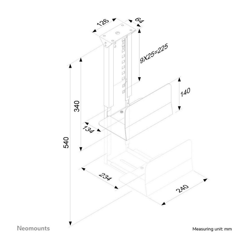 "Neomounts CPU-D200BLACK protsessorialus – maksimaalselt 30 kg – universaalne. Tüüp: lauakinnitusega protsessorialus, maksimaalne kandevõime: 30 kg, toote värvus: must. Laius: 230 mm, reguleeritav laiuse vahemik: 130–230 mm, kõrgus: 540 mm. Saatekasti laius: 370 mm, saatekasti pikkus: 200 mm, saatekasti kõrgus: 420 mm. Välimise kasti netokaal: 8,7 kg, brutokaal: 9,2 kg, kõrgus (cm): 42 cm."