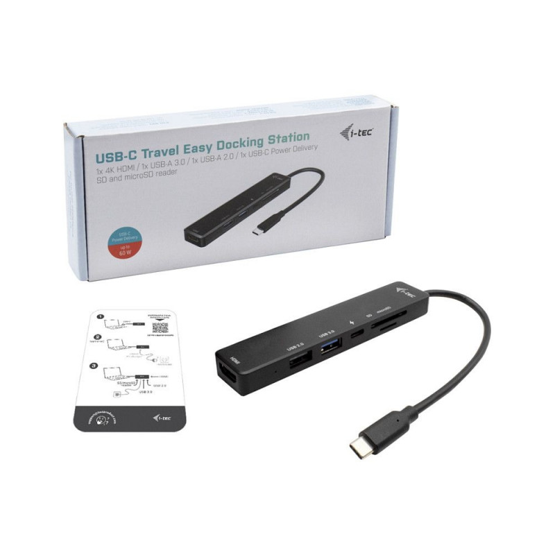 "i-tec USB-C Travel Easy Dock 4K HDMI + Power Delivery 60 W. Edastustehnoloogia: juhtmega, host-liides: USB 3.2 Gen 1 (3.1 Gen 1) Type-C, USB-toitevõimsus kuni: 60 W. Toote värvus: must, ühilduvad mälukaardid: MicroSD (TransFlash), SD. Muude operatsioonisüsteemide tugi: Android. Laius: 112 mm, sügavus: 25 mm, kõrgus: 12 mm."