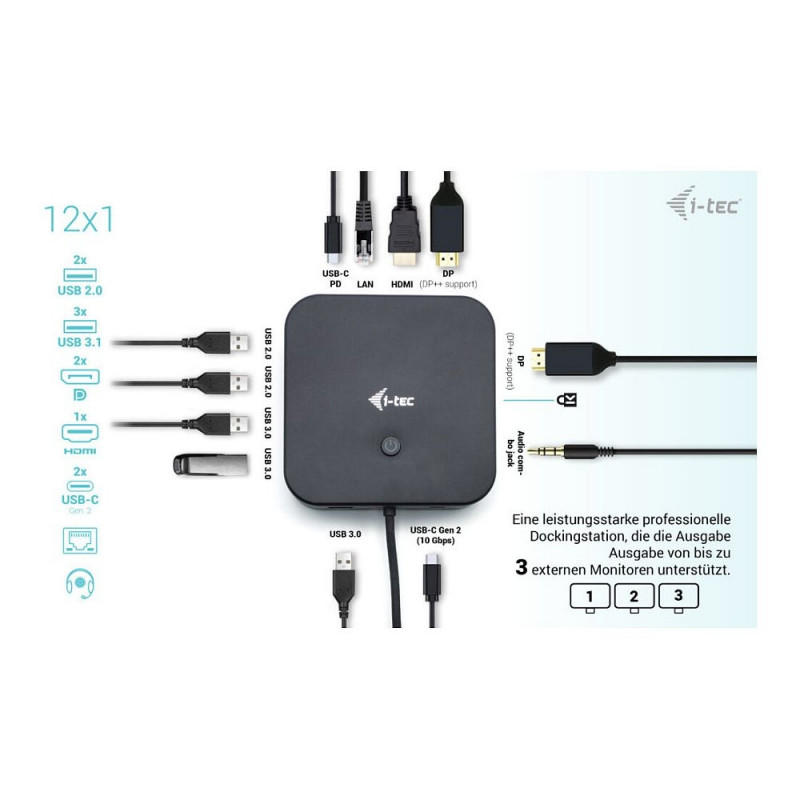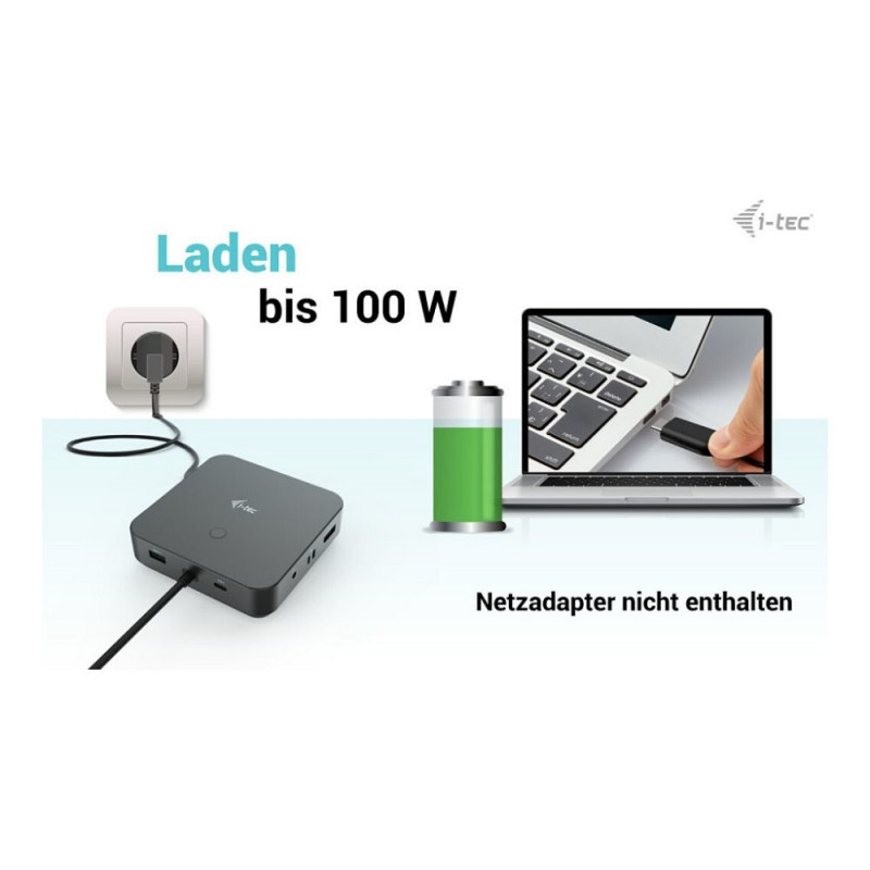 "i-tec USB-C HDMI Dual DP dokkimisjaam koos 100 W toiteedastusega. Edastustehnoloogia: juhtmega, host-liides: USB 3.2 Gen 1 (3.1 Gen 1) Type-C. Etherneti LAN andmeedastuskiirused: 10, 100, 1000 Mbit/s. Toote värvus: must, andmeedastuskiirus: 10 Gbit/s, maksimaalne kaadrisagedus: 144 Hz. USB-kaabli pikkus: 1 m. Toetatud mobiilsed operatsioonisüsteemid: Android, iOS, teiste operatsioonisüsteemide tugi: ChromeOS."