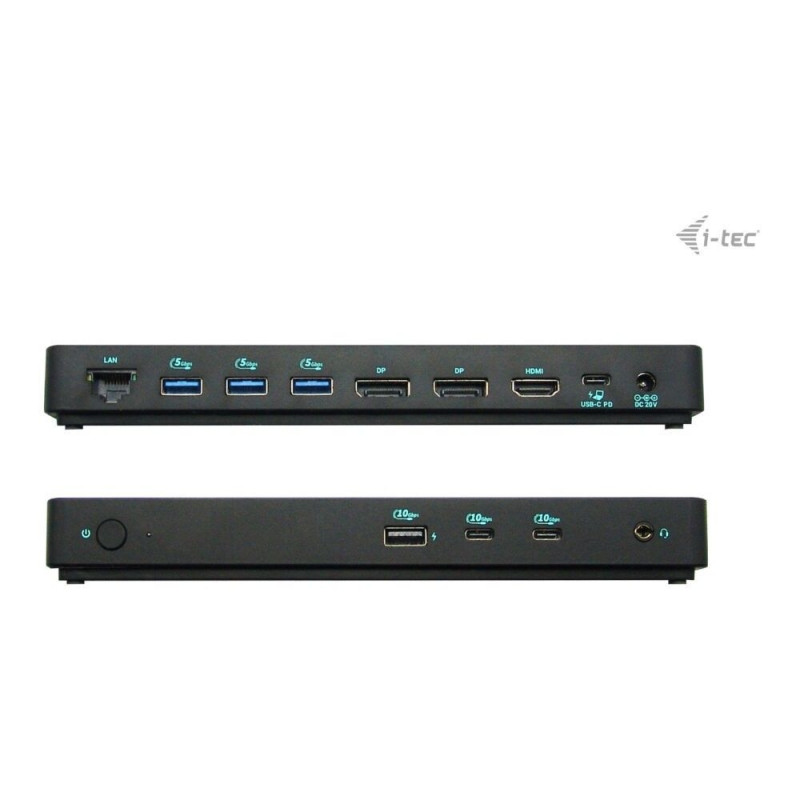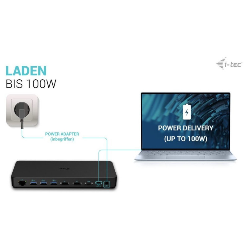 i-tec USB-C kolmekordse ekraaniga dokkimisjaam Gen 2 Pro + toiteedastus 100 W. Ülekandetehnoloogia: kaabelühendus, host-liides: USB 3.2 Gen 1 (3.1 Gen 1) Type-C, USB-toiteedastus kuni: 100 W. Ethernet LAN andmeedastuskiirused: 10, 100, 1000 Mbit/s. Toote värvus: must, andmeedastuskiirus: 10 Gbit/s, maksimaalne digitaalne eraldusvõime: 3840 x 2160 pikslit. Väljundpinge: 20 V, väljundvool: 6,5 A, ühilduvad pistikutüübid: EU. Muude operatsioonisüsteemide tugi: Android, ChromeOS
