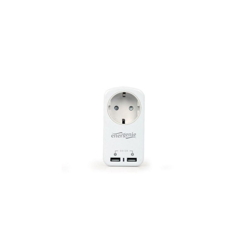 Universal 2-port 5V/2A USB charger with pass throuh AC socket<br> Just plug it into the wall socket to charge your USB-rechargeable device<br> Supports most USB-rechargeable devices, including iPod, iPhone and iPad<br> Practical pass-through AC socket AC for electrical loads up to 10 A<br> Short circuit protection and overload current protectionGembird EG-ACU2-01-W. AC input voltage: 100-250 V, AC input frequency: 50-60 Hz, Current rating: 2 A. Width: 95 mm, Depth: 58 mm, Height: 70 mm. Package width: 95 mm, Package depth: 100 mm, Package height: 105 mm