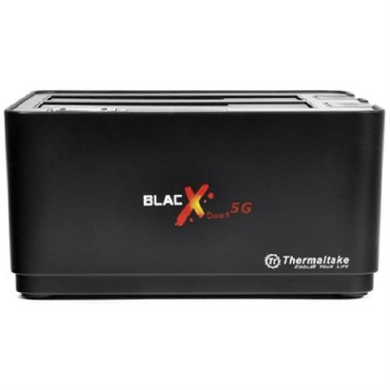- Blazing-fast USB 3.0 SuperSpeed data transfer – maximum transfer rate of up to 5.0 Gbps.<br>- Backward-Compatible with USB 2.0 (Max: 480 Mbps) & USB 1.1 (Max: 12 Mbps).<br>- Premium shielded USB 3.0 SuperSpeed cable – corrosion resistant plating & heavy gauge wires for years of reliable use.<br>- Supports all 2.5” & 3.5” SATA I/II/III hard drives up to 2TB.<br>- Simultaneously read and write two hard drives at the same time.<br>- Plug&Play Installation – no software needed and ready to work in seconds.<br>- Hot-Swap Capability for rapid multi-HDDs access & exchange.<br>- Open docking station design maximizes heat dissipation.<br>- Windows & Mac OS compatible.<br>- Windows 7 32bits & 64bits ready.Thermaltake BlacX Duet 5G. Product colour: Black, Data transfer rate: 5 Gbit/s, Compatibility: 2.5” & 3.5” SATA I/II/II HDD. Supported HDD interfaces: Serial ATA, Serial ATA II, Supported HDD sizes: 2.5,3.5". Width: 136 mm, Depth: 120 mm, Height: 73 mm. Cables included: USB. Interface: USB, Compatible operating systems: Microsoft Windows 7 / Vista / XP Mac OS