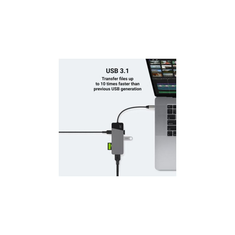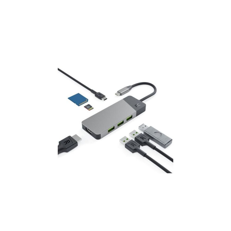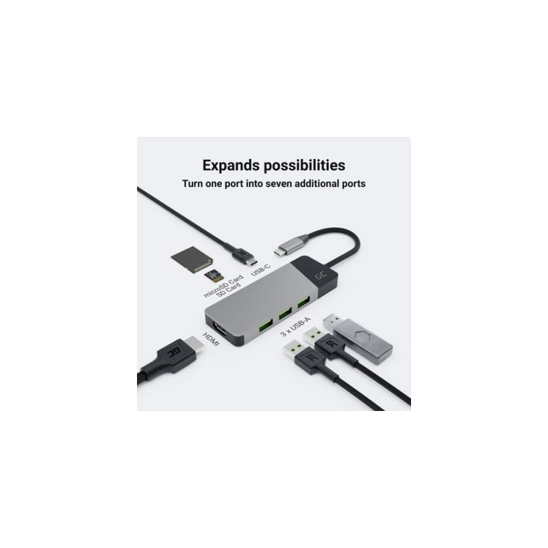 <b>GC Connect<br>Stop limiting yourself</b><br><br><b>Seven instead of one</b><br>With GC Connect, you can start using up to 7 additional accessories to increase your comfort by using a keyboard, mouse, monitor, hard drive, memory cards, and others.<br><br><b>Wide range of possibilities</b><br>Replace a USB-C port with multiple missing ports. GC Connect will provide you with a range of additional capabilities.<br><br><b>Smoothly and clearly</b><br>Connect and external monitor at 4K/60 Hz resolution and enjoy the same quality of image on both screens.<br><br><b>Provides fresh energy</b><br>Connect the power supply and take advantage of Pass-Through technology, which allows you to charge your device while transferring files or videos.<br><br><b>Gen 3.1</b><br>Upload photos, documents and other files in the blink of an eye. The three USB-A 3.1 ports handle data at up to 5 Gbps, 10 times faster than previous generation ports.<br><br><b>Light and portable</b><br>The product has benn developed by Green Cell engineers, who have ensured a small footprint and robust aluminium construction.<br><br><b>Widely compatible</b><br>Works with laptops (e.g. MacBook Air M1, M2, Dell XPS 13/15, Asus ZenBook 3), tablets (iPad Air) and OTG-enabled phones.Green Cell HUBGC01. Host interface: USB Type-C, Hub interfaces: HDMI, USB 3.2 Gen 2 (3.1 Gen 2) Type-A, USB 3.2 Gen 2 (3.1 Gen 2) Type-C, Compatible memory cards: MicroSD (TransFlash), SD. Data transfer rate: 5000 Mbit/s, Maximum refresh rate: 60 Hz, Supported graphics resolutions: 3840 x 2160. Width: 106 mm, Depth: 39.3 mm, Height: 11.3 mm. Quantity per pack: 1 pc(s)