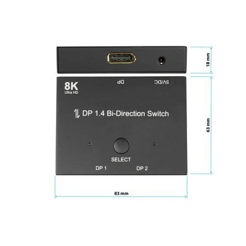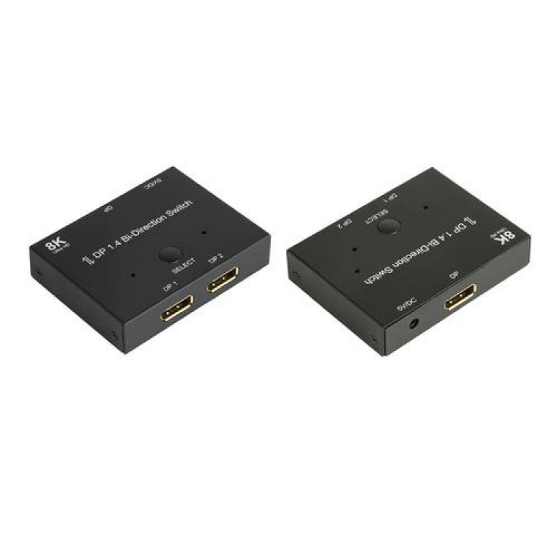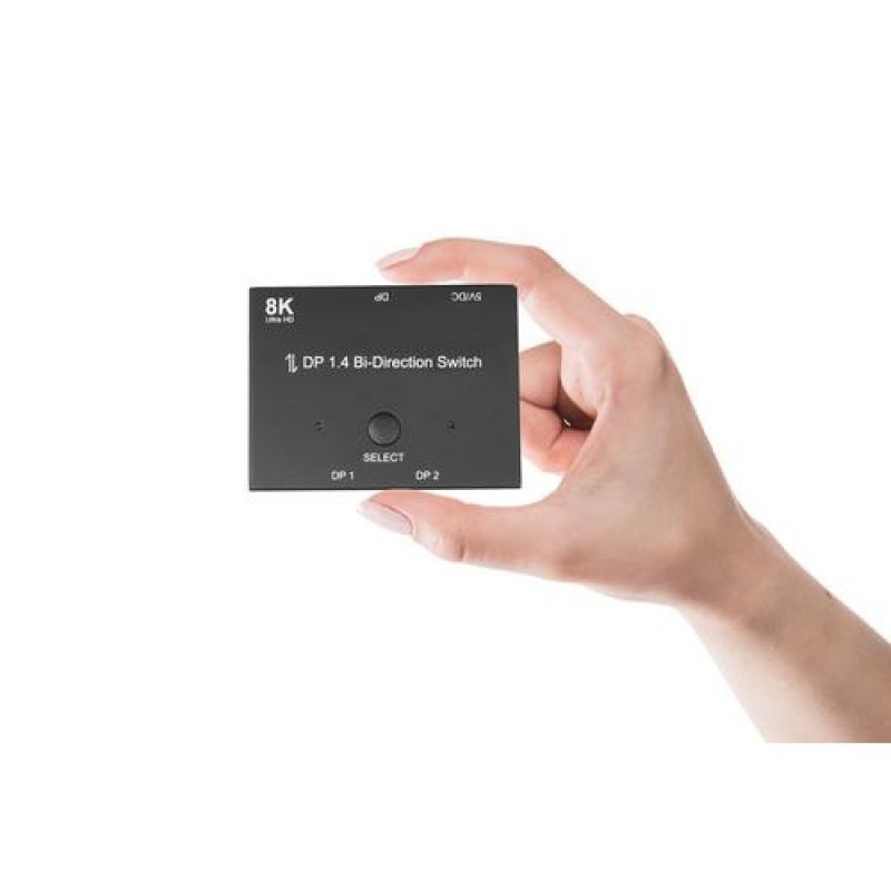 <b>DisplayPort 1.4 switch, 2-way, bi-directional, 8K @30Hz, Good Connections®</b><br>With the compact and bidirectional DisplayPort 1.4 switch from Good Connections® you always have the right solution for connecting devices and screens at hand. The switch is bidirectional and therefore suitable for two different application scenarios:<br><br><b>Application scenario - 1 in / 2 out</b><br>A device can be connected to two different screens. The screen on which the input signal is to be displayed can be selected by pressing the "Select" button. The selected output is represented by a blue LED. Please note that simultaneous output on both connected screens is not possible.<br><br><b>Application scenario - 2 in / 1 out</b><br>Two devices can be connected to one screen. The desired input signal can be selected by pressing the "Select" button. The selected input is represented by a blue LED.<br><br><b>Plug & Play</b><br>Connect and get started! Connect the DisplayPort cables of the signal source(s) and signal sink(s) to the DisplayPort connectors of the switch. Drivers are not required. Normally, no external power supply is necessary. If your existing DisplayPort devices do not provide enough power to operate the switch, the power supply can be ensured using the included USB to DC cable.Alcasa DisplayPort Switches. Video port type: DisplayPort. Material: Metal, Product colour: Black, Supported graphics resolutions: 7680 x 4320. AC input voltage: 5 V. Width: 83 mm, Depth: 63 mm, Height: 18 mm. Packaging content: Switch; USB to DC cable 1m; operating instructions