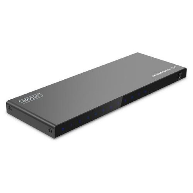 The DIGITUS® HDMI Splitter splits/mirrors your HDMI device’s audio and video signals on 8 TVs, monitors or projectors with a resolution of max. 4K / 60 Hz.<br><br>- Distributes an HDMI signal onto 8 TVs/monitors/projectors<br>- EDID management: Auto/Copy/Downscaler<br>- Max. resolution: 4K/60Hz (4:4:4)<br>- Video bandwidth: 18 Gbps<br>- Supports High Dynamic Range (HDR)<br>- Supports HDCP 2.2<br>- Supports Deep Color (36-bit)<br>- HDMI 2.0<br><br>The DIGITUS® HDMI Splitter splits your HDMI device’s audio and video signals on 8 TVs, monitors or projectors with a resolution of UHD 4K / 60 Hz. Via EDID management, you can choose from 3 modes (Copy, Auto, Downscaler). The integrated Downscaler supports the display of 4K contents on Full HD displays. Additionally, 4K as well as Full HD displays can be operated simultaneously. Thanks to its Auto-EDID function, the splitter automatically recognizes the connected displays - no manual settings required.Digitus 4K HDMI Splitter, 1x8. Video port type: HDMI, Video out: 8x HDMI. Maximum resolution: 3840 x 2160 pixels, Product colour: Black, Housing material: Metal. Power consumption (typical): 10 W. Width: 84 mm, Depth: 228 mm, Height: 15 mm. Quantity per pack: 1 pc(s), Package width: 238 mm, Package depth: 292 mm