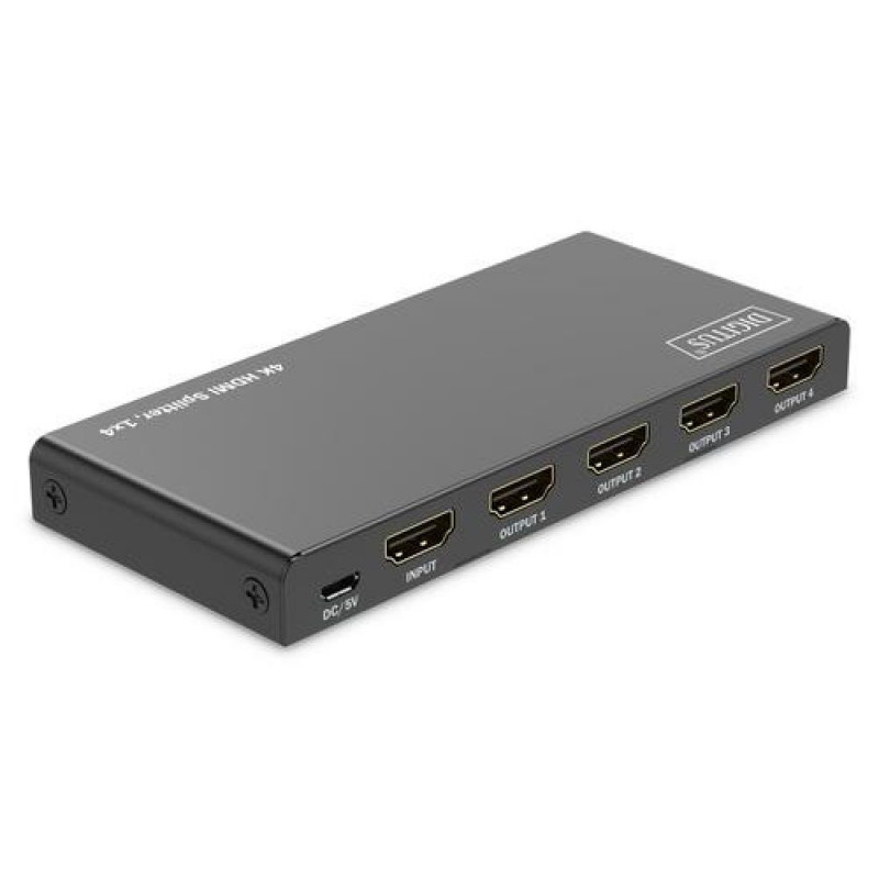 The DIGITUS® HDMI Splitter splits/mirrors your HDMI device’s audio and video signals on 4 TVs, monitors or projectors with a resolution of max. 4K / 60 Hz.<br><br>- Distributes an HDMI signal onto 4 TVs/monitors/projectors<br>- EDID management: Auto/Copy/Downscaler<br>- Power supply via Micro USB cable (included)<br>- Max. resolution: 4K/60Hz (4:4:4)<br>- Video bandwidth: 18 Gbps<br>- Supports High Dynamic Range (HDR)<br>- Supports HDCP 2.2<br>- Supports Deep Color (36-bit)<br>- HDMI 2.0<br><br>The DIGITUS® HDMI Splitter splits your HDMI device’s audio and video signals on 4 TVs, monitors or projectors with a resolution of UHD 4K / 60 Hz. Via EDID management, you can choose from 3 modes (Copy, Auto, Downscaler). The integrated Downscaler supports the display of 4K contents on Full HD displays. Additionally, 4K as well as Full HD displays can be operated simultaneously. Thanks to its Auto-EDID function, the splitter automatically recognizes the connected displays - no manual settings required. The video splitter is supplied with power via the Micro USB cable, e.g. via the source device or a USB charging adapter.Digitus 4K HDMI Splitter, 1x4. Video port type: HDMI, Video out: 4x HDMI, Connector(s): Micro USB. Maximum resolution: 3840 x 2160 pixels, Product colour: Black, Housing material: Metal. Power consumption (typical): 5 W. Width: 61 mm, Depth: 136 mm, Height: 14 mm. Quantity per pack: 1 pc(s), Package width: 123 mm, Package depth: 179 mm