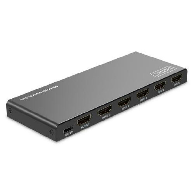 Extend your TV/monitor with additional HDMI connections – Switch conveniently between the signal sources without replugging<br><br>- Switch conveniently between 5 signal sources via remote control, on the device itself or via automatic recognition.<br>- Additional HDMI connections for your output device - 5 signal sources via just 1 HDMI connection/cable on the screen<br>- Power supply via USB-C cable (included)<br>- Max. resolution: 8K/60Hz (4:4:4)<br>- Video bandwidth: 48 Gbps<br>- Supports High Dynamic Range (HDR)<br>- Supports HDCP 2.3<br>- Supports Consumer Electronic Control (CEC)<br>- Supports Deep Color (36-bit)<br>- HDMI 2.1<br><br>The DIGITUS® 8K HDMI Switch, 5x1 offers additional HDMI connections for your output display - 5 signal sources can be connected using just 1 HDMI connection on the screen. The video changeover switch is supplied with power via the USB-C cable, e.g. via the source device or a USB charging adapter. Switch conveniently between the signal sources via remote control, on the device itself or via automatic recognition. Perfectly suited for use with wall installation of TV - only a HDMI cable is required to connect the sources.Digitus 8K HDMI Switch, 5x1. Video port type: HDMI, USB port type: USB Type-C. Material: Metal, Product colour: Black, Bandwidth: 48 Gbit/s. Power consumption (typical): 5 W. Width: 62 mm, Depth: 160 mm, Height: 14 mm. Package width: 123 mm, Package depth: 179 mm, Package height: 45 mm