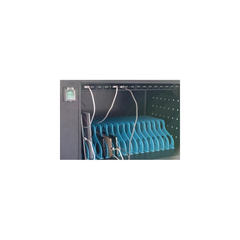 The ideal solution for storing and charging your portable devices<br><br>- 16 spaces for devices<br>- 16 x USB-C connection (5V, 3A)<br>- Compact housing, mobile thanks to mounted castors<br>- 1 x fan (24 V) for active cooling of the enclosure<br>- Incl. residual current circuit breaker 30 mA<br><br>The mobile charging cabinet from DIGITUS® is the ideal and compact solution for storing and charging your portable devices, such as notebooks and tablets. Mobile charging cabinets are often used in public facilities such as schools to securely store and charge devices in a central location. The cabinet contains 16 charging stations, each of which has its own USB port at the front. A built-in fan (24 V) in conjunction with ventilation slots ensures active cooling of the cabinet.Digitus Mobile charging cabinet for 16 tablets up to 13 inches, USB- C. Type: Portable device management cabinet, Product colour: Black, Placement: Desk, Floor. Supported portable devices: Laptop, Device connectors supported: USB Type-C, Maximum screen size: 35.6 cm (14"). Output voltage: 5 V, Output current: 3 A, Power per device: 18 W. Width: 550 mm, Depth: 375 mm, Height: 384 mm. Cables included: AC