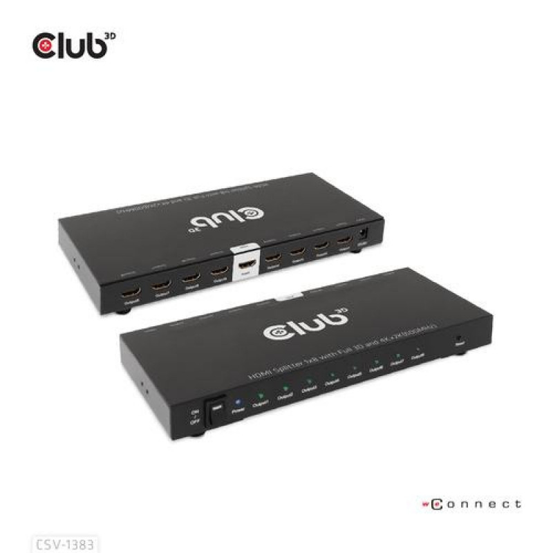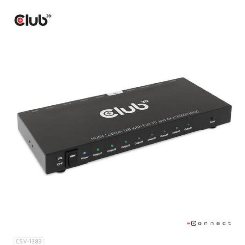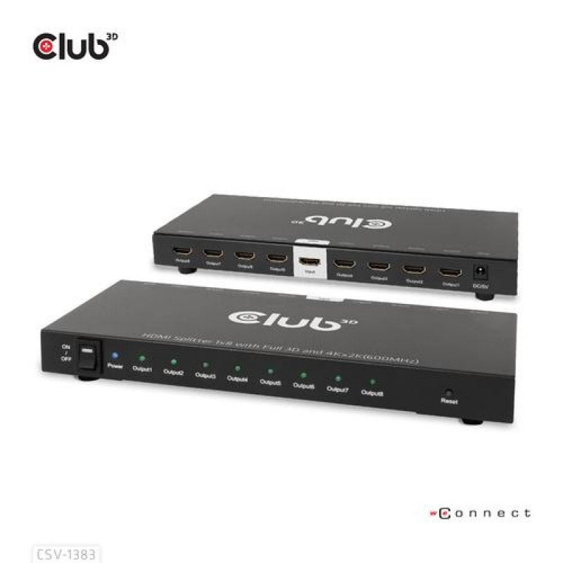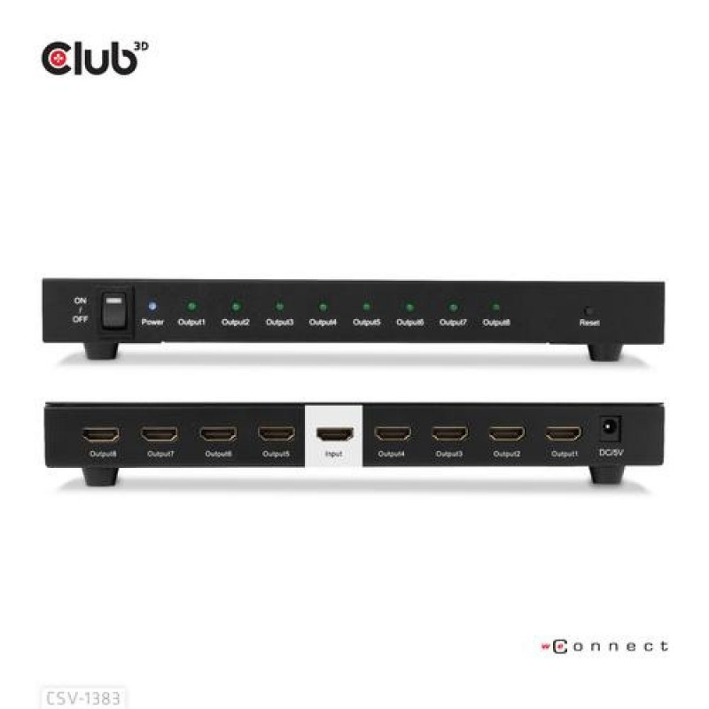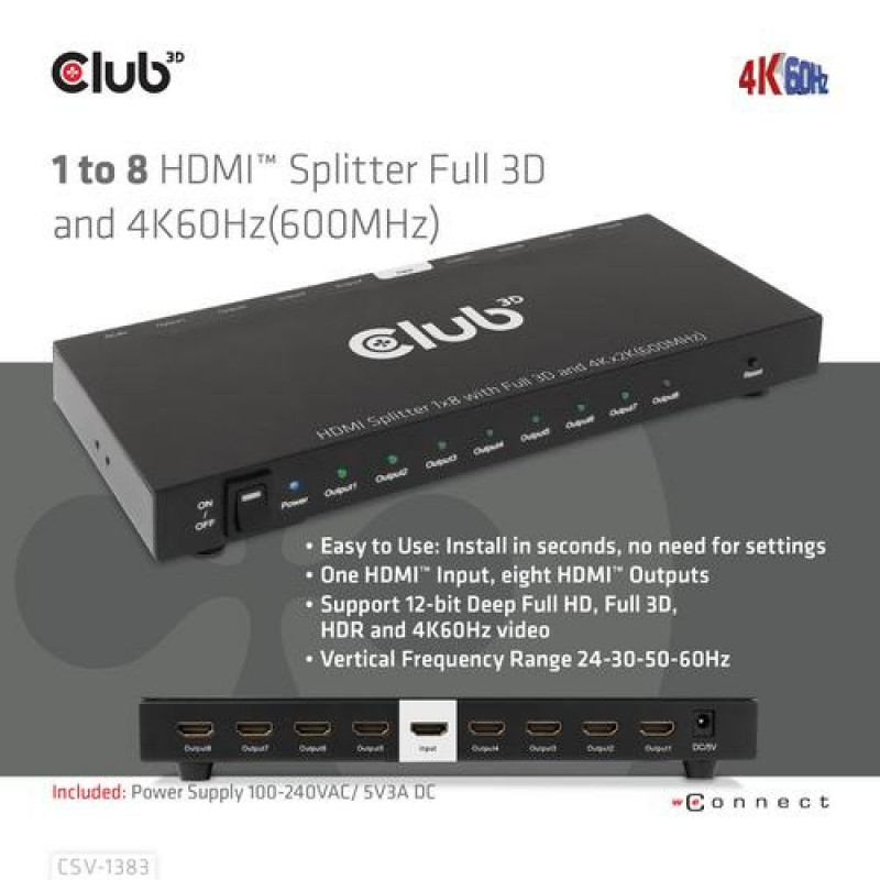 The Club 3D CSV-1383 is a high-performance and small-sized 1 to 8 HDMI™ Ultra <br>High Definition Splitter with hot plug and iron casing. It distributes the input of <br>the HDMI™ signal into eight identical outputs at the same time. It provides high <br>performance audio and video output through HDMI™ cables up to 4K@60Hz <br>resolution and is capable of receiving and transmitting up to 6Gbps/600MHz <br>bandwidth.<br>This is a high-performance and small-sized HDMI™ splitter in a metal housing with <br>an external Power Supply of 100-240VAC / 5V-3A DC, Power consumption(Max.) <br>11.3 Watt. It's an ideal assistant both at home and at work.<br>Features:<br>• Easy to Use: Install in seconds, no need for settings<br>• One HDMI™ Input, eight HDMI™ outputs <br>• Support 12-bit Deep Full HD, Full 3D, HDR and 4K60Hz video<br>• Vertical Frequency Range 24-30-50-60Hz<br>• Resolution HDTV<br> Interlaced (50&60Hz) 480i,576i,1080i<br> Progressive (50&60Hz) Max. up to 4K@60Hz<br>• Support compressed audio<br>• Support HDCP 2.2 <br>• Power Protection: the power will get disconnected automatically once the <br>voltage of the connected power adapter is above 5.5V (Note: the power <br>protection circuit will be damaged if the voltage if above 30V, so avoid <br>connecting power adapter with voltage above 30V)<br>• OS Support: Windows10/11CLUB3D 1 to 8 HDMI™ Splitter Full 3D and 4K60Hz(600MHz). Video port type: HDMI, Video out: 8x HDMI. Maximum resolution: 3840 x 2160 pixels, Product colour: Black, HD type: 4K Ultra HD. Width: 258 mm, Depth: 113 mm, Height: 35 mm. Quantity per pack: 1 pc(s), Package width: 350 mm, Package depth: 130 mm. Harmonized System (HS) code: 8473 3020