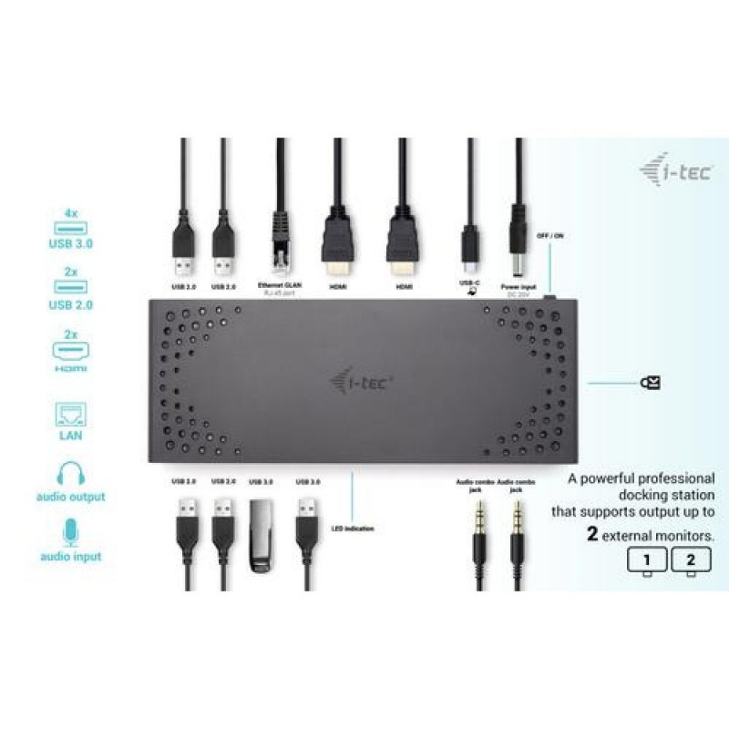 Enhance your notebook, tablet or smartphone, by utilising USB-C or USB-A connectivity. This Thunderbolt-compatible dual monitor docking station features the DisplayLink DL3900 chipset and offers the flexibility of both USB-C and USB-A host interfaces. A connecting cable with both ends (USB-C for C, USB-C for A) is a part of the package. As far as the docking station is connected either to a laptop or to a tablet that supports charging-up at its USB-C or Thunderbolt 3 port, then it is able to provide the power supply (Power Delivery) up to 100W .<br><br>2x USB-A 3.0 ports and 4x USB 2.0 make it easy to connect all of your existing hardware and the Gigabit Ethernet RJ45 port provides a reliable, robust and high-speed internet connection, supporting 10/100/1000 Mbps speeds. 3.5 mm audio jacks can be found on the front panel and an easily accessible power-saving on/off switch can be found on the rear panel. The addition of a Kensington lock slot provides additional security, especially for those working regularly in public spaces.<br><br>i-tec docking stations are compatible with the vast majority of notebook brands and platforms, making it easier than ever to connect your favourite hardware. The unit is extremely compact, perfect for use at home or in the office. Due to the hybrid interface option especially hot desk use, due to the USB-C or USB-A interface options.<br><br>- Connect your notebook, tablet or smartphone to additional monitors and your favourite hardware via a single USB-C or USB-A port (cable included)<br>- 2x HDMI support the connection of max. 2 monitors (max. resolution 2x FHD/60 Hz or single 1440p/50 Hz)<br>- 6x USB-A ports (2x USB 3.0 and 4x USB 2.0) for connecting all existing hardware and accessories.<br>- Fast network and Internet access with Gigabit Ethernet RJ-45 port, supporting 10/100/1000 Mbps speeds<br>- Kensington lock slot to discourage theft<br>- Separate 3.5 mm audio input/output jacks<br>- Power-saving on / off switch allowing a quick and easy reset of the docking station.<br>- 1x power supply input – external power adapter (output: DC 20V/6.75A)<br>- Cross-brand and cross-platform compatibility<br><br>If the docking station is connected via USB 3.0, charging of laptops and tablets is not supportedi-tec USB 3.0 / USB-C / Thunderbolt Dual Display Docking Station + Power Delivery 100W. Connectivity technology: Wired, Host interface: USB 3.2 Gen 1 (3.1 Gen 1) Type-C, USB Power Delivery up to: 100 W. Ethernet LAN data rates: 10,100,1000 Mbit/s. Product colour: Black, Data transfer rate: 5 Gbit/s, Maximum refresh rate: 60 Hz. Output voltage: 20 V, Output current: 6.75 A, Compatible power plug types: EU. Other operating systems supported: Android, ChromeOS