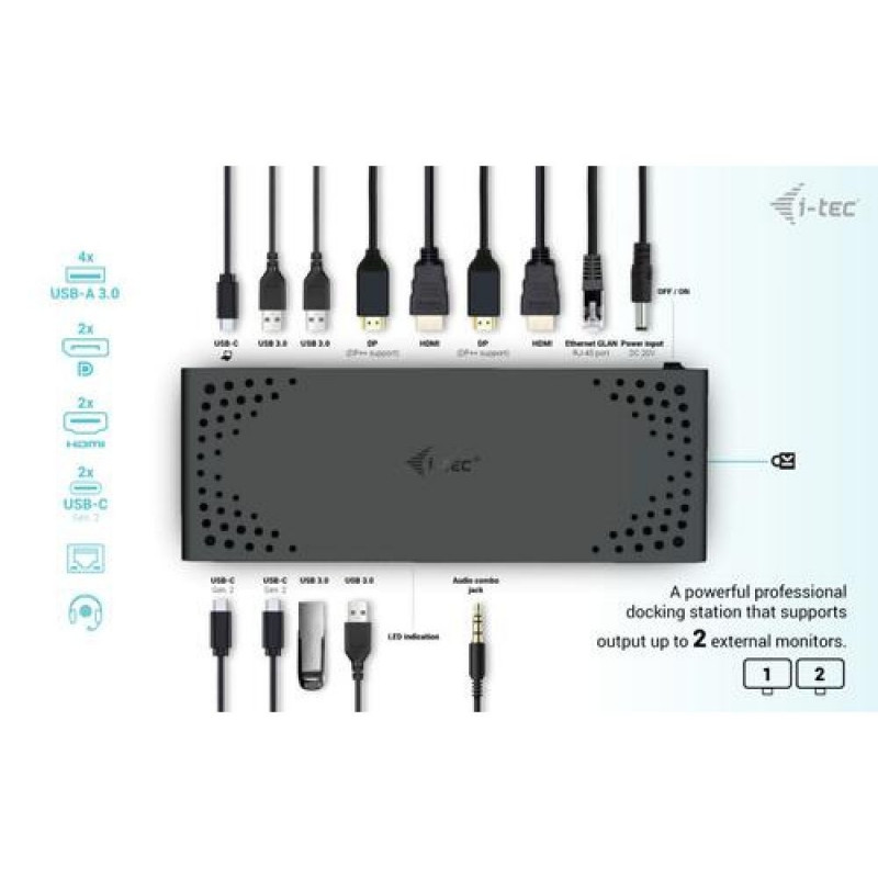 A powerful office docking station supporting super-fast USB Gen 2 ports. Dock supports output to up to two external monitors in up to 4K high resolution. The dock can be used with virtually all notebooks as it supports connection to all common ports: USB 3.0, USB-C and Thunderbolt” 3/4, while supporting all common current operating systems.<br><br>Plenty of USB ports (two USB-C support Gen 2 speeds of up to 10 Gbps), reliable and fast connection to the corporate network thanks to the integrated LAN port and support for installation behind the monitor all make this docking station the ideal companion for true professionals. Of course, it supports charging of your laptop or tablet, up to 100 W.<br><br>- Connect to 2 external monitors in resolutions up to 4K<br>- Power delivery: up to 100 W<br>- 2 DisplayPort and 2 HDMI ports available<br>- 4x USB 3.0 Gen 1 (5 Gbps) and 2x USB-C Gen 2 (10 Gbps) allow you to easily connect your USB devices and peripherals<br>- Gigabit Ethernet RJ-45 provides reliable, robust and high-speed internet connectivity with support for 10/100/1000 Mbps speeds<br>- Combo jack for audio and microphone<br>- Kensington lock provides anti-theft protection, especially in shared office environments or public areas<br>- Docking station power switch allows for maximum power savings<br>- Docking station supports a VESA mount for smart vertical installation behind a VESA-enabled monitor<br>- Supports Windows 10 / 11, macOS, Android 5 or later, Chrome OS R51 or later, Linux Ubuntu<br><br>If the docking station is connected via USB 3.0 port, charging is not supported.i-tec USB 3.0 / USB-C / Thunderbolt 3 Dual Display Docking Station Gen2 + Power Delivery 100W. Connectivity technology: Wired, Host interface: USB 3.2 Gen 1 (3.1 Gen 1) Type-C, USB Power Delivery up to: 100 W. Ethernet LAN data rates: 10,100,1000 Mbit/s. Product colour: Black, Data transfer rate: 10 Gbit/s, Maximum digital resolution: 5120 x 2880 pixels. Output voltage: 20 V, Output current: 6.5 A, Compatible power plug types: EU. Other operating systems supported: Android, ChromeOS
