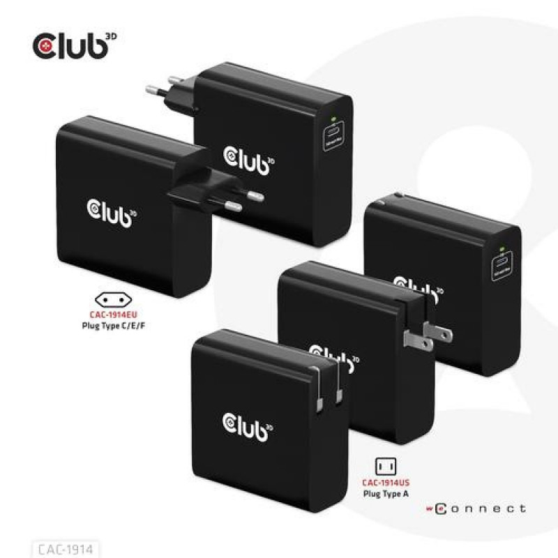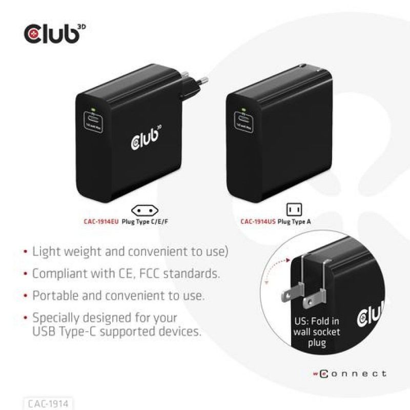 The Club 3D CAC-1914 Travel Charger 140 Watt GaN technology, Single port USB Type-C, Power Delivery(PD) 3.1 Support is Compact in size & Superior in Performance: GaN technology chipset makes this charger 50% smaller than a traditional 140Watt Laptop charger, small enough to carry anywhere. Our CAC-1914 140Watt wall charger match a variety of PD devices from smart phones to laptops, one for all making charging simple. This wide compatibility charger will be your convenient companion during your business trip or vacation.<br>The Power Charger is light weight without compromising on Quality and safety. By adopting Power Delivery(PD)3.1 charging technology, this versatile Power Charger provides you with charging function through USB Type-C interface, you can charge any connected Mobile phone / Tablet / NoteBook. Furthermore all it needs is a free USB Type-C port on your Dock/NoteBook/Tablet/ Mobile phone to be charged via the bundled USB cable.<br>Charging: By adopting PD 3.1 Charging technology and charging function through USB Type-C interface the Club 3D Power Charger offers versatile and unique functionality. It will charge your devices up to 140 Watts. Built-in safeguards protect your devices against excessive current, overcharging and overheating(OCP-OTP-SCP-OVP).<br><br>CLUB3D Travel Charger 140 Watt GaN technology, Single port USB Type-C, Power Delivery(PD) 3.1 Support. Charger type: Indoor, Power source type: AC, USB, Charger compatibility: Baby video monitor, Beard trimmer, Digital camcorder, Digital camera, Gaming controls, Headphones,.... Maximum output voltage: 28 V. USB Type-C ports quantity: 1, Power protection features: Over voltage, Overheating, Overload. Cable length: 1 m, Product colour: Black