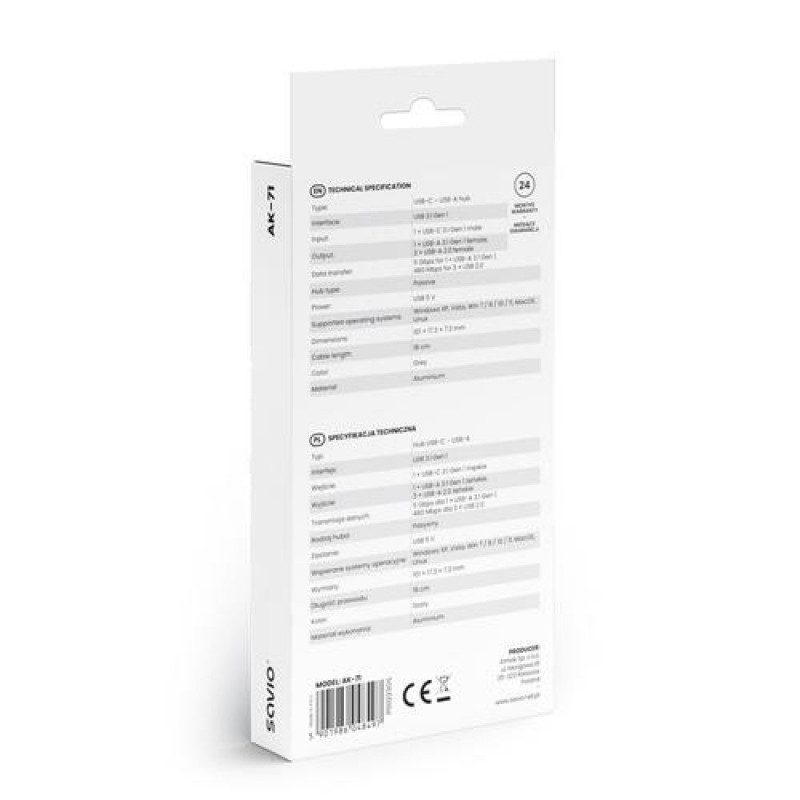 USB-C – 3 × USB-A 2.0, 1 × USB-A 3.1 GEN 1 HUB AK-71<br>The AK-71 hub is a four-port passive hub equipped with a USB-C cable. Due to that, you can expand your computer’s connectivity with additional connectors. It has a USB 3.1 Gen 1 input with a bandwidth of up to 5 Gbps and three others of USB 2.0 version. Its big advantage is compatibility with devices such as keyboards, mice, and portable memory drives.<br><br> <br><br>Technical specifications:<br><br>Type: USB-C – USB-A hub.<br>Interface: USB 3.1 Gen 1.<br>Input: 1x USB-C 3.1 Gen 1 male.<br>Output: 1x USB-A 3.1 Gen 1 female, 3x USB-A 2.0 female.<br>Data transmission: 5 Gbps for 1x USB-A 3.1 Gen 1, 480 Mbps for 3x USB-A 2.0/.<br>Hub type: Passive/.<br>Power supply: USB 5 V.<br>Supported operating systems: Windows XP, Vista, Win 7 / 8 / 10 / 11, macOS, Linux.<br>Dimensions: 101 x 17.3 x 7.3 mm.<br>Cable length: 18 cm.<br> <br><br>AK-71 01 in blue background EN<br><br> <br><br>Additional ports<br>Expanding the number of available USB ports with the AK-71 USB-C hub is a key solution if you regularly use multiple peripherals simultaneously. This allows you to connect both an external drive and a mouse or keyboard at the same time without having to constantly switch between them. This increases your work efficiency and allows you to use your computer more smoothly and comfortably. Especially when your desk space is limited. The AK-71 hub is particularly useful for modern laptops, which often have fewer inputs.<br><br> <br><br>Support for USB standards<br>The AK-71 from Savio allows you to optimize bandwidth and efficiency with different types of devices. This allows you to maximize information transfer rates for devices that require higher data transfer. Use the USB-A 3.1 Gen 1 port to increase the bandwidth of external drives, and the USB-A 2.0 ports to connect a mouse or keyboard. This will allow you to manage your resources more efficiently and flexibly.<br><br> <br><br>Plug & Play function<br>The Savio hub uses a Plug & Play function. You don’t need to install any additional driver to take full advantage of the adapter. This significantly simplifies the hardware setup process and its first use.Savio AK-71