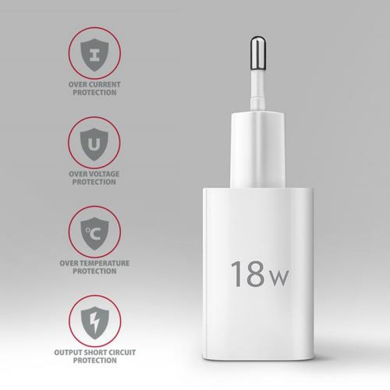 The AXAGON ACU-QC18W USB wallcharger is designed for charging mobile devices. With 18W of maximum power, the charger charges phones, tablets and other mobile devices at the highest possible speed. The adapter offers a standard USB-A connector.<br><br>The charger is equipped with Quick Charge 3.0 USB Type-A enabling fast charging of smartphones and tablets with a power of up to 18W. The adapter is also compatible with other fast phone charging standards such as Apple iPhone, iPad, Samsung, Huawei, Honor, Xiaomi, Motorola and other.<br><br>The advanced protection system at the charging adapter output protects the device being charged from damage. The charger function also detects the device being charged and selects the optimal charging speed and progress.<br><br>The body of the power adapter has a pleasant shape and compact size. The combination of small dimensions and a wide range of input voltages, makes the charger an ideal travel helper.<br><br>Input:<br>• input voltage AC 100V-240V / 0.4A / 50-60 Hz (function WIV), supports multiple national power standards<br>• two-pin euro plug - integrated in the body of the charger<br><br>Output:<br>• USB-A port QC (phones) max. 18W: 5V/3A, 9V/2A, 12V/1.5A<br>• Charging technology: QC 3.0, QC 2.0, AFC, FCP, SMART, Apple 2.4A<br><br>Maximum power:<br>• maximum power 18W<br>• maximum current 3A <br><br>Supported charging technologies:<br>• Standard charging of all devices that support 5V and Apple iPhone 5, 6, SE, 7 charging. <br>• SMART - charging max. 5V/3A, Quick Charge 1.0, USB Battery Charging 1.2 (DCP 1.5A) and Apple 2.4A (iPad).<br>• FCP - quick charging using Huawei Fast Charge Protocol.<br>• AFC - quick charging using Samsung Adaptive Fast Charging protocol.<br>• QC - quick charging using Qualcomm Quick Charge 2.0, Quick Charge 3.0.<br><br>The charger supports WIV, AIC and CC functions:<br>• Wide Input Voltage - function of a wide range of input voltage; it protects the adapter against undervoltage and overvoltage at the input and allows the use of more “national power standards”.<br>• Automatic Intelligent Communication - function of automatic recognition of the connected device to select optimal charging parameters.<br>• Constant Output Current - the current hold function prevents the output power fluctuations; this function ensures steady course of charging.<br><br>Complex output protection: OCP, OVP, OTP, OSP: <br>• Over Current Protection. Protection of output against current overload.<br>• Over Voltage Protection. Protection against overvoltage at the output.<br>• Over Temperature Protection. Protection against overheating of the adapter.<br>• Output Short Circuit Protection. Short circuit protection at the output.<br><br>Other features:<br>dimensions of the charger body 79 x 42 x 27 mm including a plug,<br>• weight: 47 g,<br>• material: non-flammable plastic.<br><br>Package contains:<br>• white wall charger,<br>• multilingual guide CZ / DE / DK / ENG / ESP / FIN / FR / GR / HR / HU / IT / NL / PL / PT / RO / RU / SK / SWE / TR / BG / CN / ARA,<br>• packed in a cardboard box with a hanging hole.Axagon ACU-QC18W. Charger type: Indoor, Power source type: AC, Charger compatibility: Mobile phone, Smartphone, Smartwatch, Tablet, Universal. Input voltage: 100 - 240 V. USB 2.0 ports quantity: 1, Fast charging, Power protection features: Over voltage, Overheating, Overload, Short circuit, Under voltage. Product colour: White