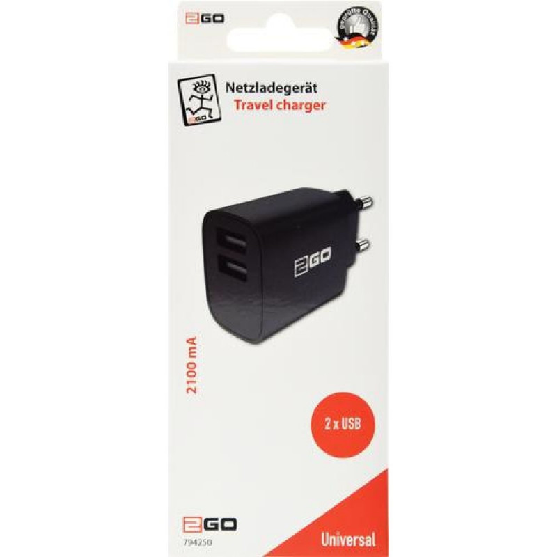 <br />2GO 794250. Charger type: Indoor, Power source type: AC, Charger compatibility: Universal. Input voltage: 100 - 240 V. USB 2.0 ports quantity: 2. Product colour: Black