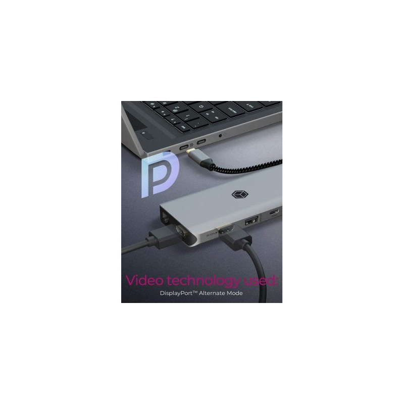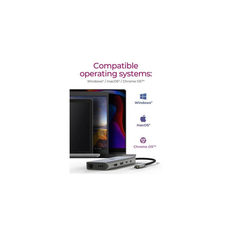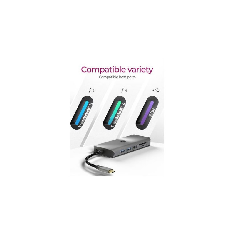 <b>Seamless Integration & Con- nectivity</b><br>Navigate seamlessly between devices and enjoy the perfect com- plement both at home and on the move. Equipped with plenty of USB ports for external devices, the product offers optimal versatility, secure and stable Gbit LAN for fast connections and headset jack included.<br><br><b>Ready for the future: Experience 8K quality!</b><br>8K resolution is the future of picture quality, and this device is already geared towards it. Connect two 4K monitors or immerse yourself in the breathtaking clarity of a single 8K display. From detailed graphics tasks to cinema experiences. Taking your performance to a new level. <br><br><b>Reliable display transmission</b><br>With DisplayPort™ Alternate Mode, we define a reliable and high- quality way to transmit graphics signals from your host device. This approach ensures seamless visual transmission and guarantees that every image, every colour and every detail is displayed as intended. ICY BOX IB-DK4061-CPD. Connectivity technology: Wired, Host interface: USB 3.2 Gen 1 (3.1 Gen 1) Type-C, USB Power Delivery up to: 100 W. Ethernet LAN data rates: 10,100,1000 Mbit/s. Product colour: Grey, Compatible memory cards: MicroSD (TransFlash), SD, Maximum refresh rate: 30 Hz. USB cable length: 0.15 m. Other operating systems supported: ChromeOS