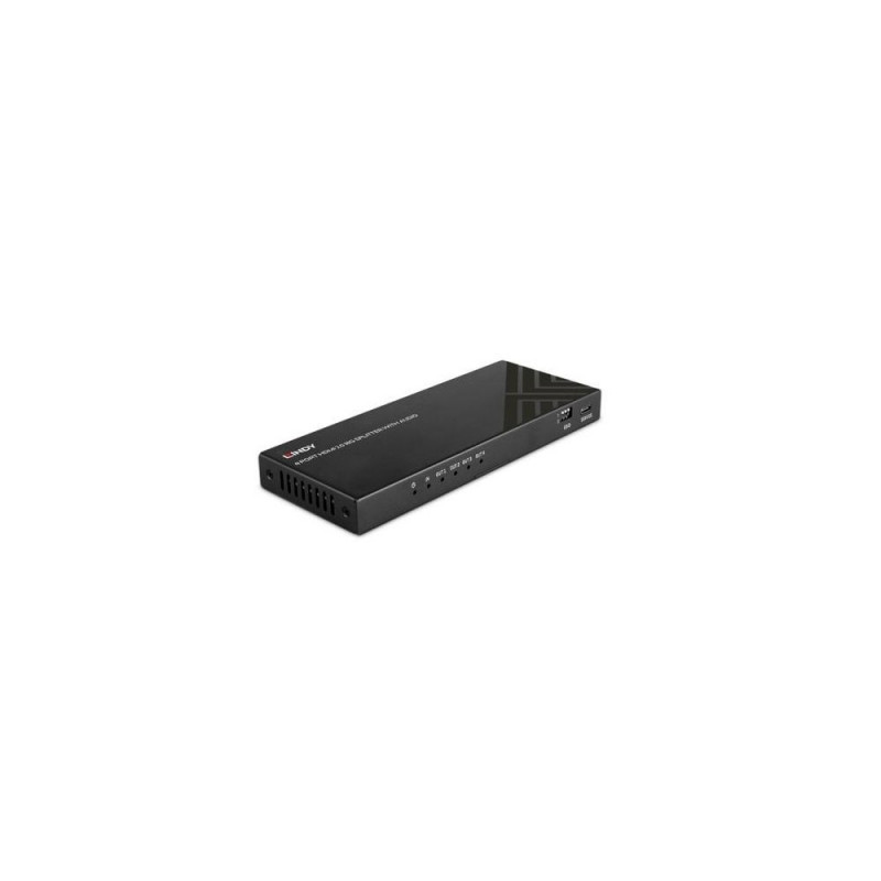 The Lindy 4 Port HDMI® 8K60 Splitter with Audio is a multi-function solution for distributing high quality HDMI® signals across 2 displays simultaneously from one source device, while extracting digital or analogue audio separately.<br><br>With support for resolutions up to 8K 60Hz 4:4:4 8bit, this splitter is great for creating eye-catching dual display digital signage in retail scenarios, displaying live video across two screens at event venues or distributing engaging multiscreen educational presentations at tradeshows.<br><br>The splitter also has separate optical and 3.5mm audio ports to easily extract audio from HDMI® to connect non-HDMI® amplifiers or soundbars, ideal for supporting video with immersive multichannel audio.<br><br>The splitters also features an integrated switch to downscale the input signal to 4K or Full HD, making installations with older displays hassle free while always ensuring the viewer receives the optimum picture from their display.<br><br>The terms HDMI, HDMI High-Definition Multimedia Interface, HDMI Trade dress and the HDMI Logos are trademarks or registered trademarks of HDMI Licensing Administrator, Inc.Lindy 4 Port HDMI 8K60 Splitter with Audio. Video port type: HDMI, Video out: 4x HDMI, Headphone connectivity: 3.5 mm. Maximum resolution: 7680 x 4320 pixels, Product colour: Black, Housing material: Metal. AC input voltage: 5 V, Input current: 2 A. Width: 176 mm, Depth: 17 mm, Height: 68 mm. Quantity per pack: 1 pc(s), Package width: 240 mm, Package depth: 70 mm