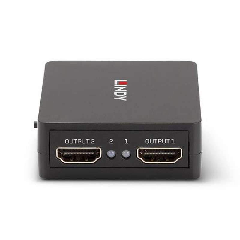 The Lindy 2 Port HDMI 18G Splitter is a compact, low cost solution for easily splitting one 4K HDMI source device across two 4K HDMI displays.<br><br>With support for resolutions up to 4K 3840x2160 @60Hz, content can be viewed in superior clarity across dual displays.<br><br>Additional support for High-Dynamic Range ensures video content can be seen with enhanced brightness, superior contrasts and a much wider colour gamut, for more lifelike colour.<br><br>The splitter's compact design and ability to be powered by USB allows for a simple and discreet installation into a variety of environments, from home entertainment setups to office use.Lindy 2 Port HDMI 18G Splitter, Compact. Video port type: HDMI, Video out: 2x HDMI. Maximum resolution: 3840 x 2160 pixels, Product colour: Black, Housing material: Metal. Width: 60.5 mm, Depth: 54 mm, Height: 20.5 mm. Package width: 133 mm, Package depth: 105 mm, Package height: 24 mm. Cables included: USB