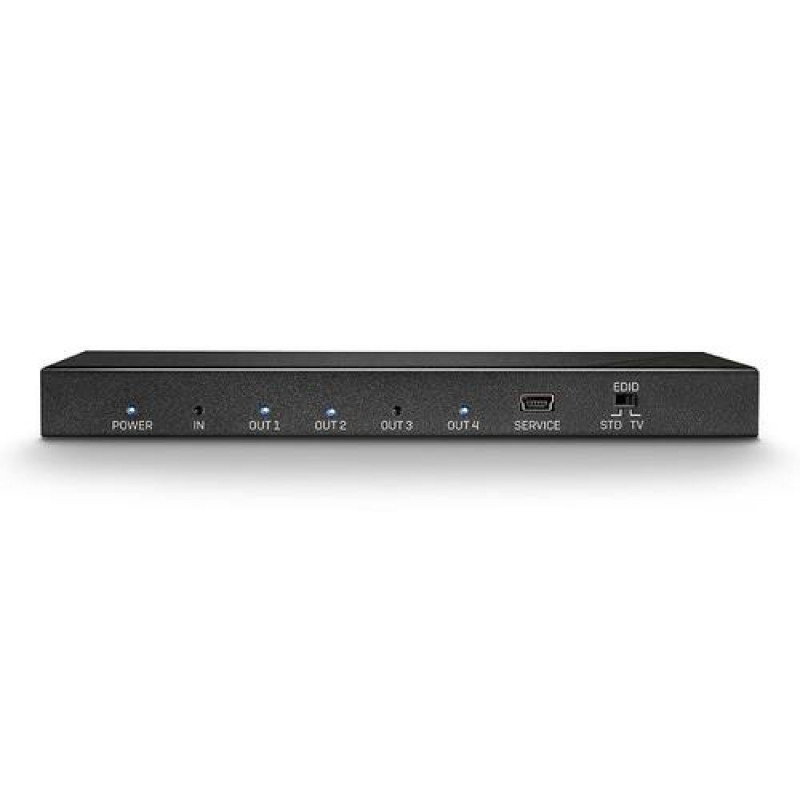 The Lindy 4 Port HDMI 2.0 18G Splitter is a compact, high quality solution for distributing HDMI 2.0 18G signals across multiple displays from one source device. With support for resolutions up to 4K 60Hz 4:4:4 8bit, this splitter is great for creating eye-catching digital signage in retail scenarios, showing high quality video in different rooms in medical facilities or ensuring audiences do not miss any of the action in dual display sports bars. Additional support for High-Dynamic Range ensures video content can be seen with enhanced brightness, superior contrasts and a much wider colour gamut, for more lifelike colour.<br><br>HDCP 2.2 support ensures there are no issues with a variety of 4K content when connected to source devices including set top boxes, Blu-Ray players and 4K HDR media players, while a smart EDID management switch on the unit provides maximum compatibility with the display. The splitters durable, compact design also ensures the unit can be installed discreetly, ensuring there is no distraction from the content on screen.Lindy 4 Port HDMI 18G Splitter. Video port type: HDMI, Video out: 4x HDMI. Maximum resolution: 3840 x 2160 pixels, Product colour: Black, Housing material: Metal. AC input voltage: 5 V, Input current: 1 A. Width: 163 mm, Depth: 63 mm, Height: 16 mm. Package width: 248 mm, Package depth: 55 mm, Package height: 183 mm