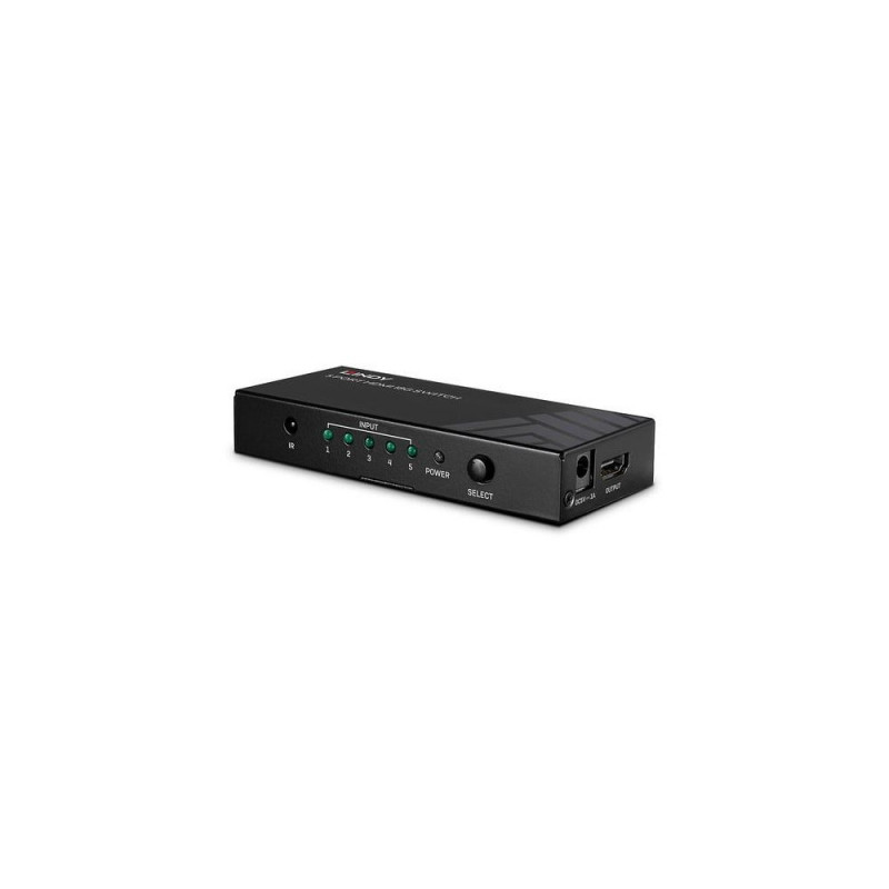 Switches between 5 HDMI source devices when connected to a single display<br>Supports 18G resolutions up to 4K@60Hz, with additional support for HDR<br>Flexible control via push button, IR remote and auto-switching<br>Compact, minimalist design to ensure no distraction from the display or installation<br>2 year warranty<br><br>HDMI switches are reliable solutions for controlling and switching multiple HDMI source devices and outputting to a single display.<br><br>The Lindy 5 Port HDMI 18G switch is a compact, high quality solution for effortlessly switching between 5 HDMI source devices when connected to a single display.<br><br>Supporting HDMI 18G signals, this switch allows for the transmission of detailed 4K Ultra HD resolutions, while additional support for HDR ensures video content features greater contrasts and a much wider colour gamut. The switch is perfect for a premium residential setup, eye-catching digital signage in retail settings or engaging presentations. HDCP 2.2 support ensures there are no compatability issues with a variety of 4K content from source devices including set top boxes, Blu-Ray players and 4K HDR media players.<br><br>This switch also provides efficient, simple switching options for the user, via an included IR remote or push buttons on the main unit. The switch can also identify the active HDMI source device and automatically switch to this option, providing a useful solution for when the unit is required to be out of sight.Lindy 5 Port HDMI 18G Switch. Video port type: HDMI. Material: Metal, Product colour: Black, Bandwidth: 18 Gbit/s. Certification: CE, FCC, REACH & California Proposition 65. Width: 123 mm, Depth: 51 mm, Height: 20 mm. Package width: 180 mm, Package depth: 135 mm, Package height: 80 mm