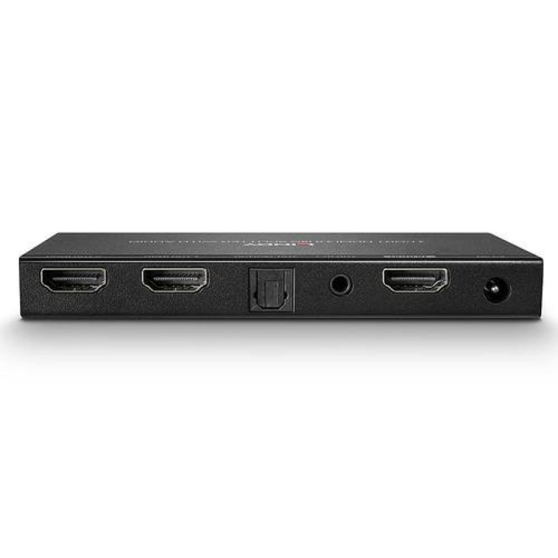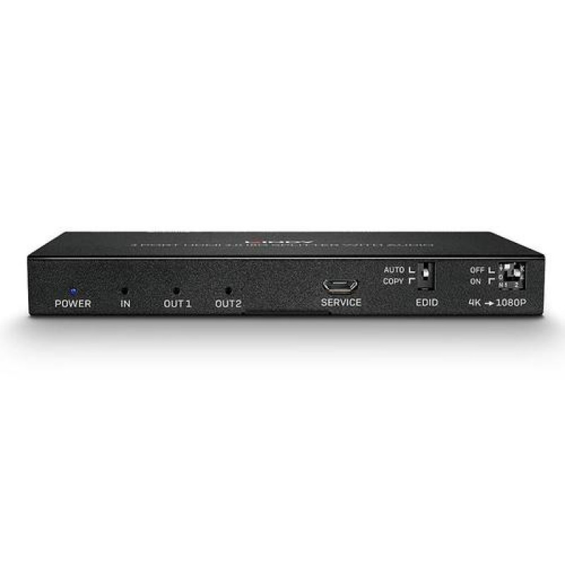 The Lindy 2 Port HDMI 18G Splitter with Audio is a multi-function solution for distributing high quality HDMI signals across 2 displays simultaneously from one source device, while extracting digital or analogue audio separately.<br><br>With support for resolutions up to 4K 60Hz 4:4:4 8bit, this splitter is great for creating eye-catching dual display digital signage in retail scenarios, displaying live video across two screens at event venues or distributing engaging multiscreen educational presentations at tradeshows. The splitter also has separate optical and 3.5mm audio ports to easily extract audio from HDMI to connect non-HDMI amplifiers or soundbars, ideal for supporting video with immersive multichannel audio.<br><br>The splitters also features an integrated switch to downscale the input signal to Full HD, making installations with older displays hassle free while always ensuring the viewer receives the optimum picture from their display.Lindy 2 Port HDMI 18G Splitter with Audio and Downscaling. Video port type: HDMI, Video out: 2x HDMI. Maximum resolution: 4096 x 2160 pixels, Product colour: Black, Housing material: Metal. Output voltage: 5 V, Output current: 1 A. Width: 120 mm, Depth: 14.4 mm, Height: 63 mm. Package width: 205 mm, Package depth: 65 mm, Package height: 115 mm