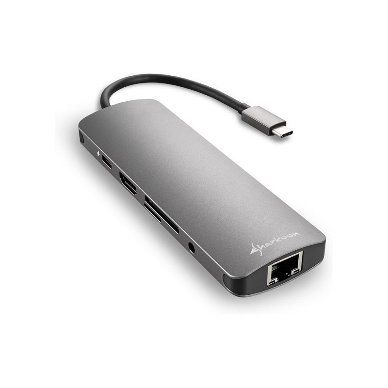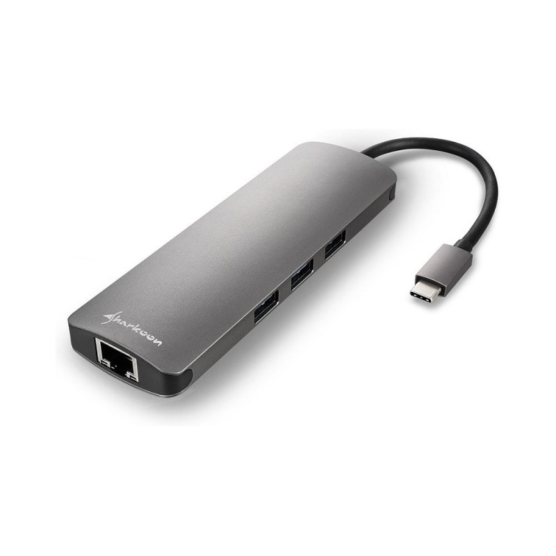 Sharkoon USB 3.0 Type C Combo Adapter. Hostiliides: USB Type-C, väljundliides: HDMI, RJ-45, USB 3.2 Gen 1 (3.1 Gen 1). Toote värvus: hall, maksimaalne kaabli pikkus: 132 m. Andmeedastuskiirus (maks): 5 Gbit/s. Laius: 130 mm, sügavus: 44 mm, kõrgus: 15 mm.