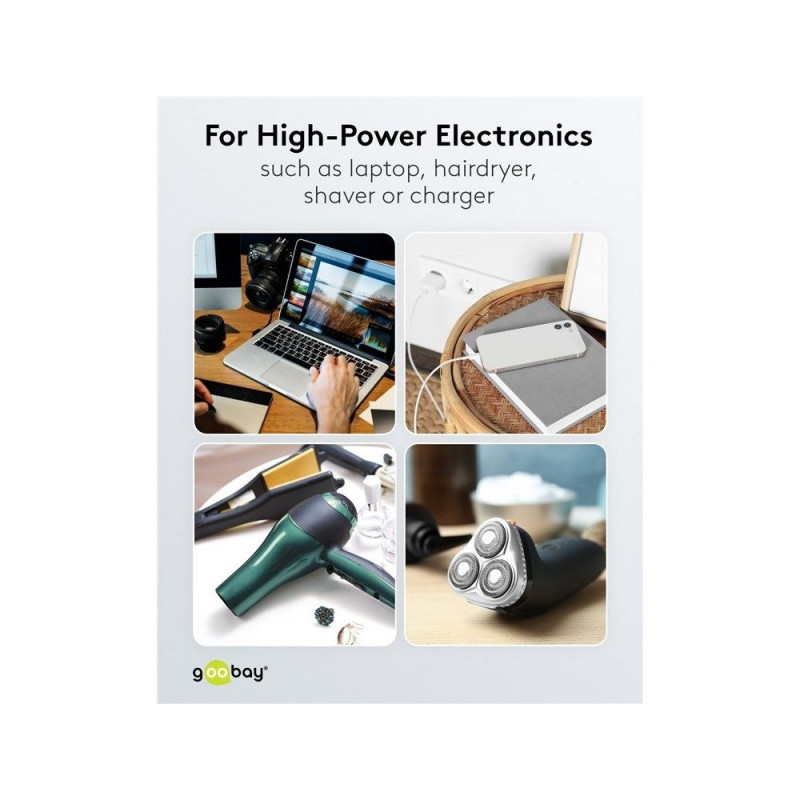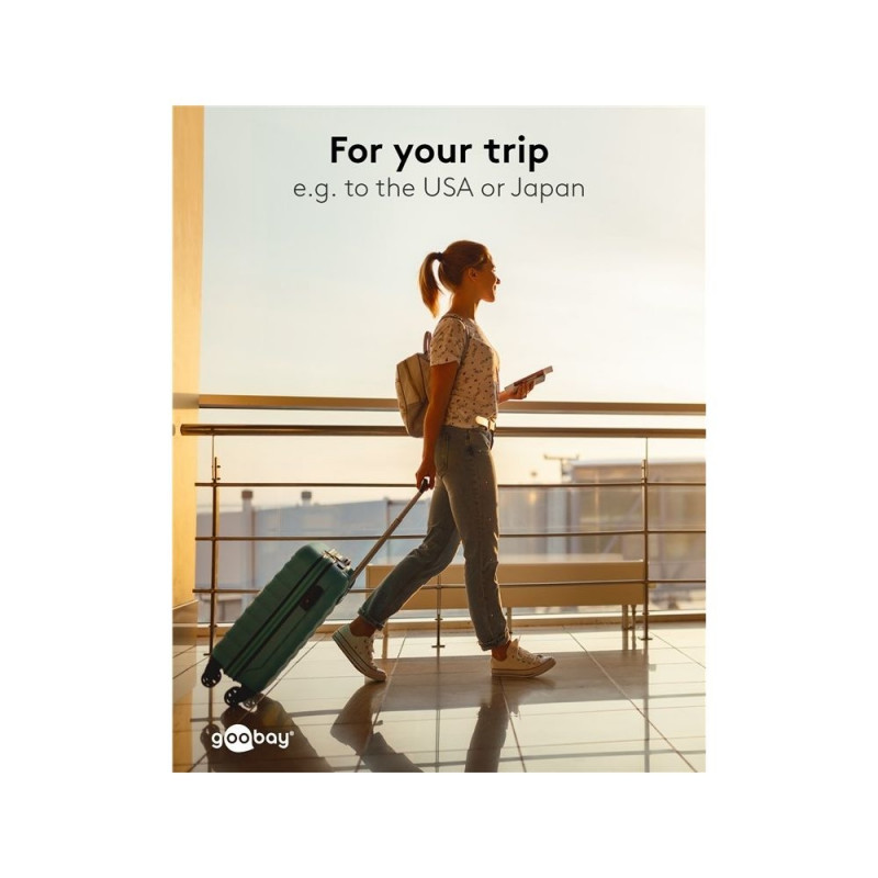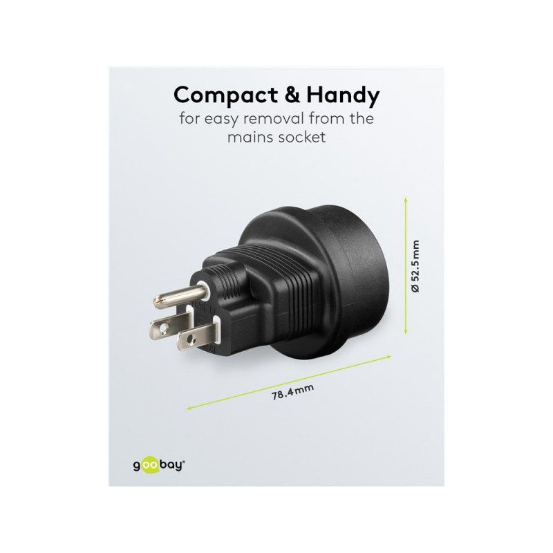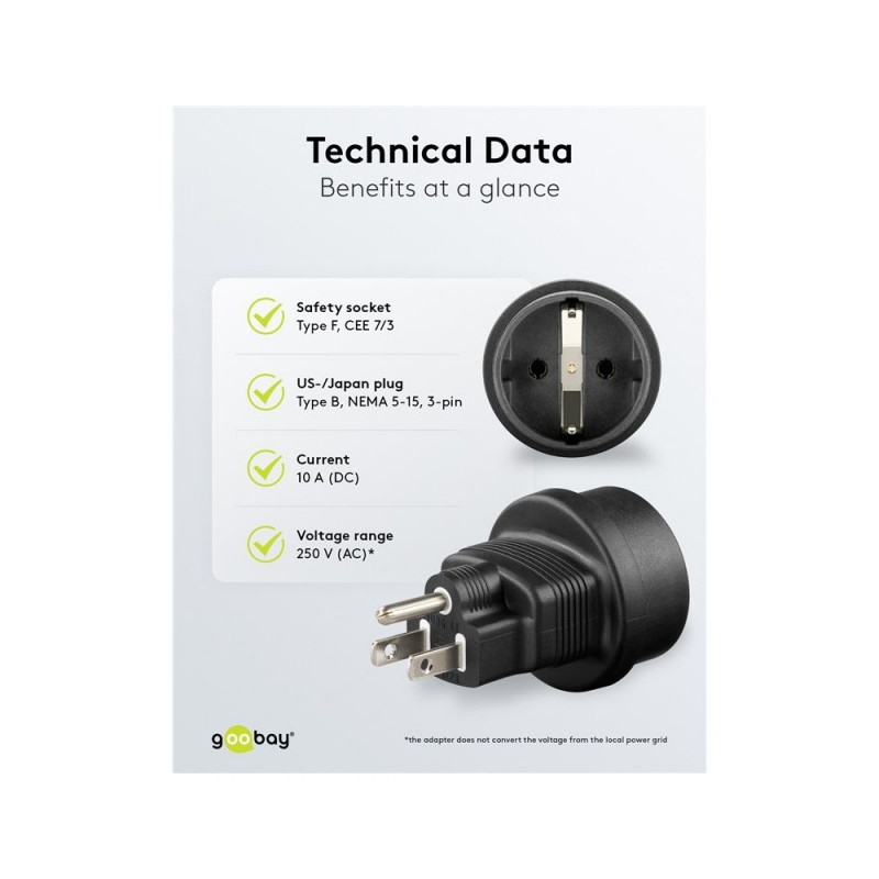 goobay Travel adapter Europe to USA/Japan, black - For connecting devices from Europe (type F) to sockets in the USA/Japan (type B) - Practical travel plug for connecting electrical appliances with a safety plug (type F) to sockets in the USA or JapanOsta kohe, viimased eksemplarid laos!