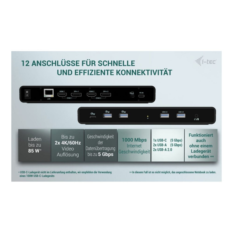 i-tec universaalne kahe 4K-ekraaniga dokkimisjaam + toiteedastus 85 W. Ülekandetehnoloogia: juhtmega, host-liides: USB 3.2 Gen 1 (3.1 Gen 1) Type-C, USB-toiteedastus kuni: 85 W. Etherneti LAN andmeedastuskiirused: 10, 100, 1000 Mbit/s. Toote värvus: must, andmeedastuskiirus: 5 Gbit/s, HD-tüüp: 4K Ultra HD. Toiteallikas: vahelduvvool (AC), toitevõimsus: 100 W, ühilduvad pistikutüübid: EU. Muude operatsioonisüsteemide tugi: Android, ChromeOS