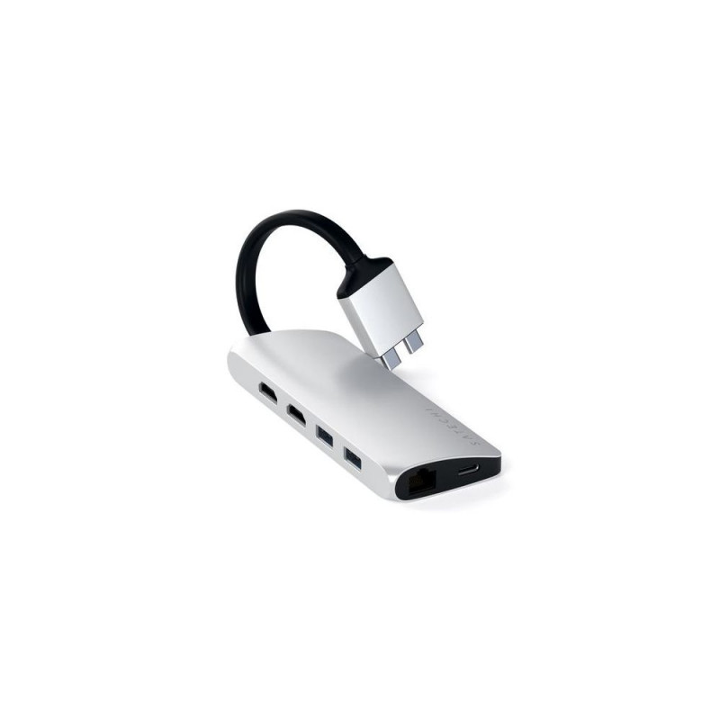 <b>4K DUAL MULTIMEDIA ADAPTER</b><br>Engineered as our most powerful adapter to date, the Satechi Type-C Dual Multimedia Adapter is your all-in-one solution to connect all your peripherals. <br><br><b>Patent Pending Design</b><br>Features a patent-pending dual-connector design to easily expand your computer’s two USB-C ports for a powerful, seamless workspace.<br><br><b>Dual 4K HDMI Display</b><br>Enjoy brilliant 4K HDMI display extended across two monitors, for a stunning dual setup. Includes one 4K 60Hz port and one 4K 30Hz port.<br><br><b>A Port for Every Peripheral</b><br>The Dual Multimedia Adapter has a port for every peripheral with two 4K HDMI, a USB-C PD charging, Gigabit Ethernet, micro/SD card readers, and USB 3.0 ports.<br><br><b>Compatibility</b><br>2019/2018 MacBook Pro, 2018 MacBook Air and 2018 Mac Mini. Does not support MacBook models with single USB-C port.Satechi ST-TCDMMAS. Host interface: USB 3.2 Gen 1 (3.1 Gen 1) Type-C, USB Power Delivery up to: 60 W. Product colour: Silver, Compatible memory cards: MicroSD (TransFlash), MicroSDHC, MicroSDXC, SD, Hub interfaces: USB 3.2 Gen 1 (3.1 Gen 1) Type-C. Power supply type: USB, Power consumption (typical): 60 W. Width: 125 mm, Depth: 49 mm, Height: 19 mm. Quantity per pack: 1 pc(s)