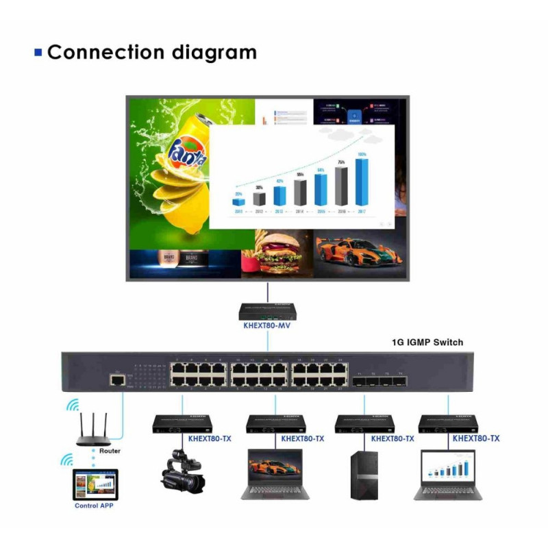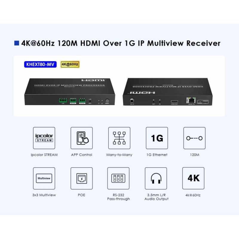 | emiumCord 4K HDMI over IP Matrix receiver for displaying multiple images on one monitor. This receiver works with the transmitter code | khext80-TX and can work in a common matrix. |
