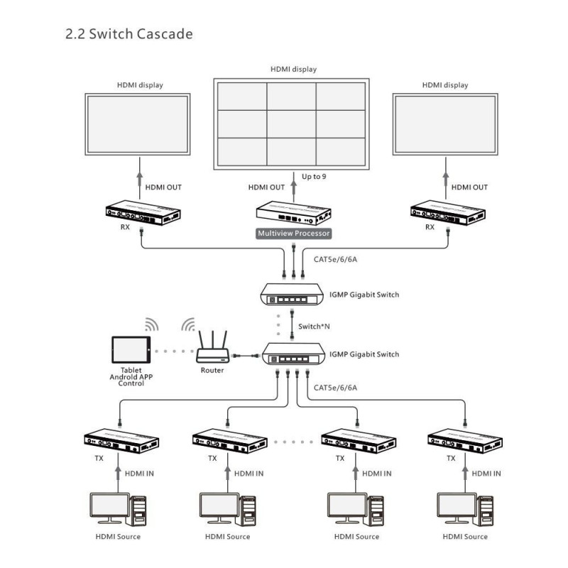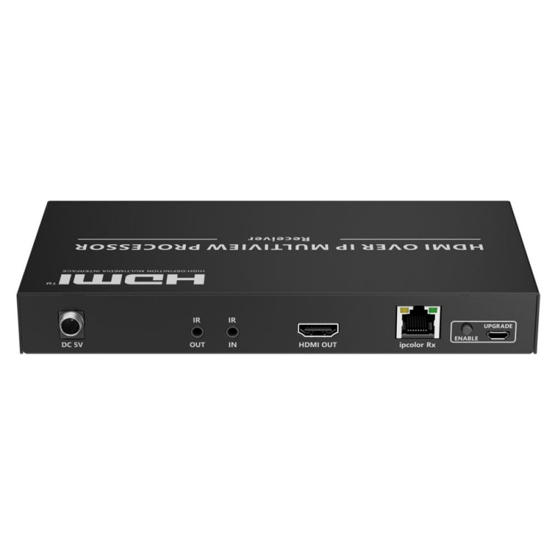 PremiumCord 4K HDMI over IP Matrix receiver for displaying multiple images on one monitor. This receiver works with the transmitter code: khext80-TX and can work in a common matrix. The device allows you to connect multiple HDMI signal sources via a 1G network and display multiple images simultaneously on one monitor. Settings can be made using the APP. - The Multiview Processor receiver allows you to use multiple transmitters in a 1G network and display multiple images on one monitor. - Supports 4K@60Hz 3840×2160 @ 60Hz.up to 120m - Resolution:4096x2160@24/30Hz, 3840x2160@24/30/50/60Hz,1080p@50/60Hz,720p@50/60Hz, 1920x1200@60Hz,2560x1440@60Hz - Transmission rate:18Gbps - Supports: HDCP 1.4/HDCP 2.2 - Built on ipcolor STREAM™ technology for high-definition and low-latency transmission. - Multiple image settings on one monitor can be controlled by APP - When connected to the iMCS over IP matrix, it supports simultaneous reception and processing of multiple signals. In conjunction with the iMCS app, it allows remote control of on-screen display, four-panel and nine-panel display, as well as adjustment of display size and position. - Compatible with Cat5e/6 or higher network cables, the transmission distance of CAT6 cable is 120m. - Supports one-to-one or many-to-many connection via Gigabit switch. - Supports 3.5mm L/R channel audio separation. - Supports one-way IR control (20~60kHz) - Supports IR learning remote control and device control via app - Create multi-screen connection with video wall up to 5×5 (also including 1×1 / 1×2 / 1×3 / 1×4 / 1×5 / 2×1 / 2×2 / 2×3 / 2×4 / 2×5 / 3×1 / 3×2 / 3×3 / 3×4 / 3×5 / 4×1 / 4×2 / 4×3 / 4×4 / 4×5 / 5×1 / 5×2 / 5×3 / 5×4 / 5×5) via switch and app control. Supports 256 signal source inputs and 256 signal outputs, providing flexible many-to-many matrix configuration (requires app control when connecting more than 100 transmitters and receivers). - Matrix extender transmits image, sound. - Firmware update via Micro USB port - Lightning, surge and ESD protection - Stable operation 24/7 - Working temperature: - 20°C~60°C - Power supply from the set 5V 8W - Metal case - Color: black - Transmitter dimensions: length: 191mm, width: 96mm, height: 25mm - Weight: 518 g link to download the control application https://www.ipcolor.org/download.html