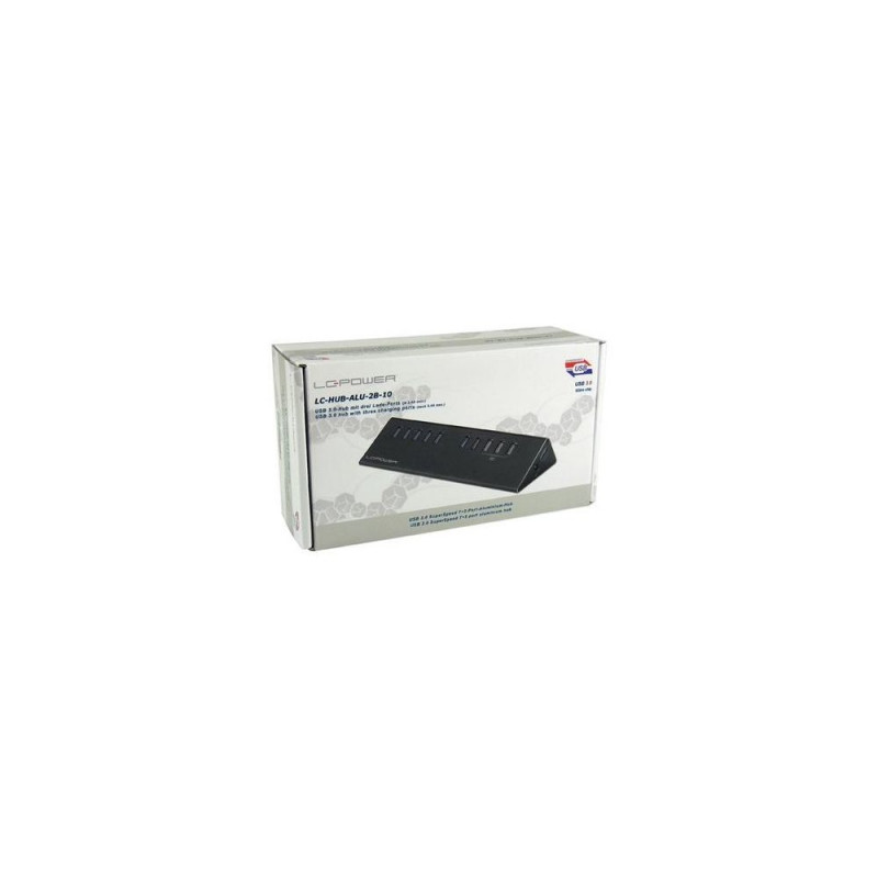 <b>Connect up to 7 peripherals to your computer via USB.</b><br><br>- USB 3.0 interface, downwardly compatible to USB 2.0/1.1<br>- Charge up to three peripherals via USB<br>- Note: Charging ports have no data transfer feature<br>- Superspeed up to 5 Gb/s (USB 3.0)<br>- Highspeed up to 480 Mb/s (USB 2.0)<br>- Fullspeed up to 12 Mb/s (USB 1.1)<br>- Microsoft Windows XP, Vista, 7, 8, 8.1, 10, Mac OS 10+LC-Power LC-HUB-ALU-2B-10. Host interface: USB 3.2 Gen 1 (3.1 Gen 1) Micro-B, Hub interfaces: USB 3.2 Gen 1 (3.1 Gen 1) Type-A. Data transfer rate: 5000 Mbit/s, Product colour: Black, Housing material: Aluminium, Plastic. Power source type: DC, Input voltage: 100 - 240 V, AC input frequency: 50 - 60 Hz. Width: 198 mm, Depth: 66 mm, Height: 33 mm. Cables included: USB