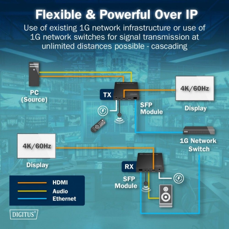 - Paindlik ja tõhus üle IP: Kasuta olemasolevat 1G võrguinfrastruktuuri või 1G lüliteid praktiliselt piiramatuks kauguseks – toetab kaskaadühendust