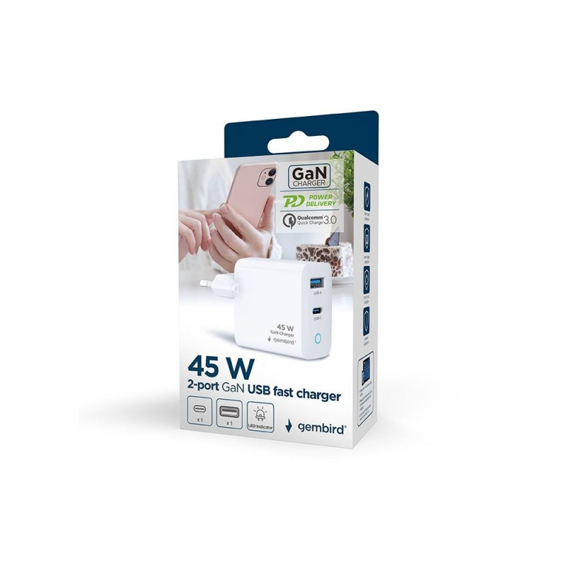 Mobile Device Charger - Gembird TA-UC-PDQC45L 45W Fast Charge USB-A & USB-C White