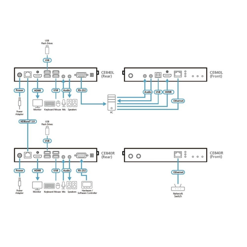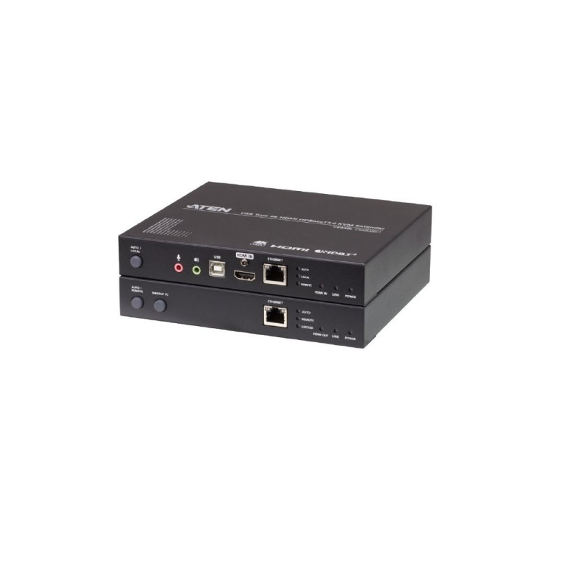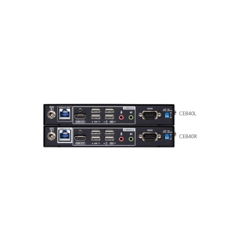 CE840 USB True 4K HDMI HDBaseT 3.0 KVM Extender Adopting the latest HDBaseT 3.0 technology, CE840 USB True 4K HDMI HDBaseT 3.0 KVM Extender consists of a local unit and a remote unit, enabling uncompressed True 4K HDMI, audio, RS232, Ethernet, and USB signal transmission across 100m over a single Cat 6A cable (ATEN 2L-2920 Cat 6A Cable recommended) or above. Installation is made easy, neat, and cost-efficient with no compromises on high quality distribution of AV content. The CE840 allows for dual console operation via the two USB ports for USB keyboard and mouse connection and the pushbuttons for switching USB control console between the remote and local end. LEDs on the front panel help indicate which USB control mode that is currently on. Moreover, each unit contains an HDMI output port for local control and the other two USB 2.0 ports for USB peripheral connection. Consequently, operators can acquire data and manage equipment in one location, even from a distance. The CE840 showcases excellent AV performance with no compression and zero latency. In addition to the support for HDR 10+, the extender is also capable of delivering video signals at up to True 4K (3840 x 2160 @ 60 Hz 4:4:4 and 4096 x 2160 @ 60 Hz 4:4:4) over 100 m. The extender also supports individual stereo audio and HDMI audio formats including LPCM 7.1CH, Dolby TrueHD, Dolby Digital Plus, and DTS-HD Master Audio. CE840 is an ideal solution for medium to large size applications that require uncompressed AV and control signal extension and remote access and control, including factories, warehouses, data centers, as well as medical and healthcare applications where precise visualization and accurate representation are essential. Features - HDBaseT 3.0 – supports True 4K HDMI, audio, RS232, Ethernet, and USB signal transmission across a long distance via a single Cat 6A cable (ATEN 2L-2920 Cat 6A Cable recommended) or above with no compression and zero latency - Superior video quality – supports HDR10+ and video resolutions up to True 4K (3840 x 2160 @ 60 Hz 4:4:4 and 4096 x 2160 @ 60 Hz 4:4:4) over 100 m - Dual console operation – control the system via the USB keyboard, mouse and HDMI monitor consoles installed on both the local and remote ends - Active console selectable via the pushbutton on the remote unit and local unit - enables USB-based signal control from either the remote or local end, with LEDs indicating the USB control mode - Flexible 4 x USB 2.0 extension - each of the remote unit and the local unit contains 2 ports for USB keyboard and mouse connection and 2 ports for other USB peripheral connection - Supports individual stereo audio and HDMI audio formats including LPCM 7.1CH, Dolby TrueHD, Dolby Digital Plus, and DTS-HD Master Audio - HDCP2.3 and 2.2 compliant - Supports widescreen formats - Built-in 8KV/15KV ESD protection - Firmware upgradable - No software or driver installation required - Rack-mountable