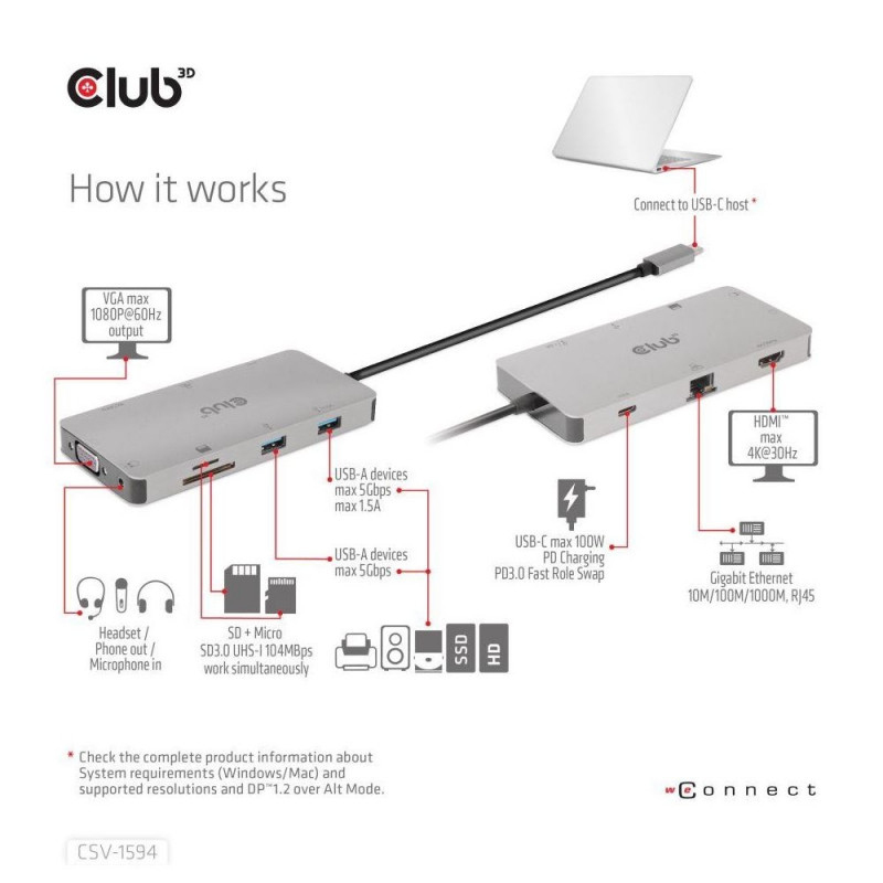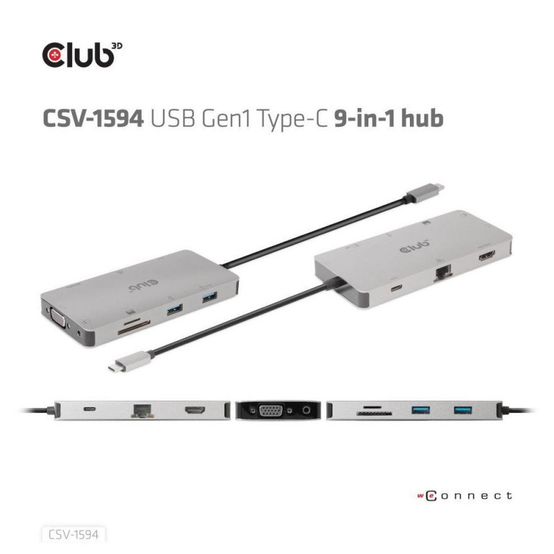Club 3D CSV-1594 USB Gen1 Type-C 9-ühes jaotur HDMI™, VGA, 2x USB Gen1 Type-A, RJ45, SD/Micro SD kaardipesade ja USB Gen1 Type-C emaspordiga pakub väga arenenud ja tõhusat lahendust, et laiendada ühte USB Gen1 Type-C porti mitmeks pordiks. See ühendab endas video-, andme- ja toitepordid, võimaldades ühendada korraga kaks ekraani, et nautida videoid suuremal ekraanil, ühendada mitu USB Gen1 seadet andmeedastuseks kuni 5 Gbps, ühendada Gigabit Etherneti allikas, et tagada arvutile ülikiire võrguühendus, või ühendada kõrvaklapid, et nautida suurepärast muusikat. Lisaks toetab see PD laadimist kuni maksimaalselt 100 W, võimaldades seadet kasutada ja samal ajal hosti laadida. Seade töötab kõigi DP™1.2 Alt režiimi toetavate USB Gen1 Type-C hostidega.