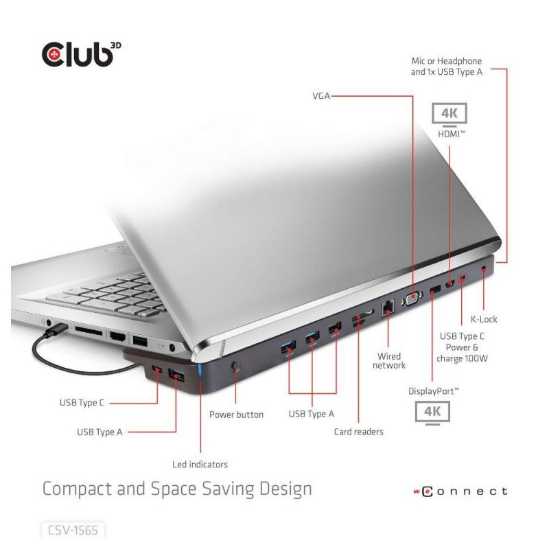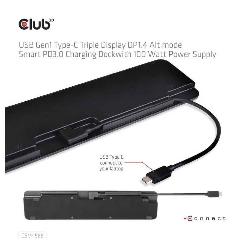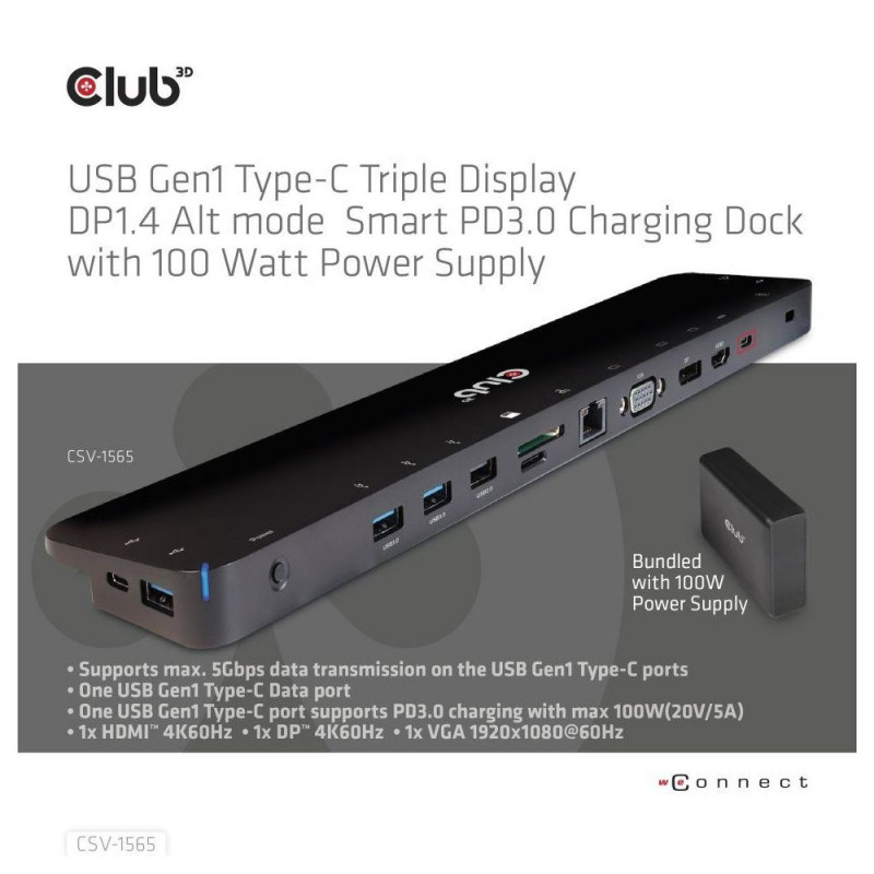 Club-3D CSV-1565 USB Gen1 Type-C kolmikekraaniga DP1.4 Alt režiimi nutikas PD3.0 laadimisdokk on integreeritud lahendus, mis ühendab endas video-, andme-, toite-, võrgu- ja helifunktsioonid, olles eriti sobiv sagedastele reisijatele. Kolm erinevat videoväljundit (HDMI™, DisplayPort™, VGA) võimaldavad nautida kolme erinevat pilti (1x HDMI™ 4K60Hz või 1x DP™ 4K60Hz või 1x VGA 1920x1080@60Hz) või videot kolmel erineval ekraanil (1x 4K30Hz + 2x 1080p@60Hz) samaaegselt MST režiimis. USB Type-A ja USB Type-C andmepordid võimaldavad ühendada mitu USB-seadet hostiga. USB Type-C laadimispordi kaudu saab dokki toita ning samal ajal laadida ka hostarvutit, kui ühendada PD3.0 toiteadapter – sülearvuti toiteplokki pole vaja kaasas kanda. See tähendab, et kasutaja saab reisida kergemalt. Micro SD ja SD/MMC pesad võimaldavad lugeda mälukaardil olevat infot hostarvutisse. 3,5 mm helipordi kaudu saab nautida hosti muusikat kõrvaklappidega. Lisaks võimaldab gigabitine Etherneti port kasutada hostis kiiret võrguühendust. Toode toetab kõiki DP1.4 Alt režiimi toega hostseadmeid (PC, sülearvuti, mobiiltelefon jne). Dünaamiline voolutuvastus ja toitejaotus tähendab, et toode ei võta enam välisest PD3.0 toiteallikast fikseeritud võimsust, vaid arvestab tegelikku enda tarbitavat võimsust, võimaldades arvutit dünaamiliselt suurema võimsusega laadida. Videoväljundi jaoks peab allikseade toetama DisplayPort™ 1.4 Alt režiimi.