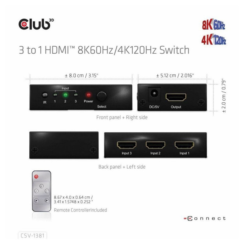 Club 3D CSV-1381 on 3-ühes HDMI™ standardile vastav lüliti, mis suunab sinu kõrglahutusega video ja digitaalse heli ükskõik millisest HDMI™ sisendist 8K60Hz/4K120Hz HDMI™ väljundisse. See on kõige lihtsam viis ühendada oma kõrglahutusega mängukonsoolid ja/või arvuti/sülearvuti ühe kõrglahutusega HDMI™ ekraaniga, mille eraldusvõime on kuni 8K60Hz või 4K120Hz. Kõik sisendid suudavad samaaegselt toetada kuni 8K60Hz/4K120Hz kõrglahutusega videosignaale. Väljund edastab kõrglahutusega audio/video signaali kõrglahutusega (8K60Hz) HDMI™ standardile vastavale ekraanile. Sisendite vahetamine toimub kas seadmel asuva nupu abil või IR-puldi kaudu, mis teeb lülitamise lihtsaks. Tegemist on suure jõudlusega ja väikese HDMI™ 8K lülitiga, mis on metallkorpuses ning töötab välise toiteallikaga (100-240VAC / 5V-1A DC). See on ideaalne abimees nii kodus kui ka tööl.