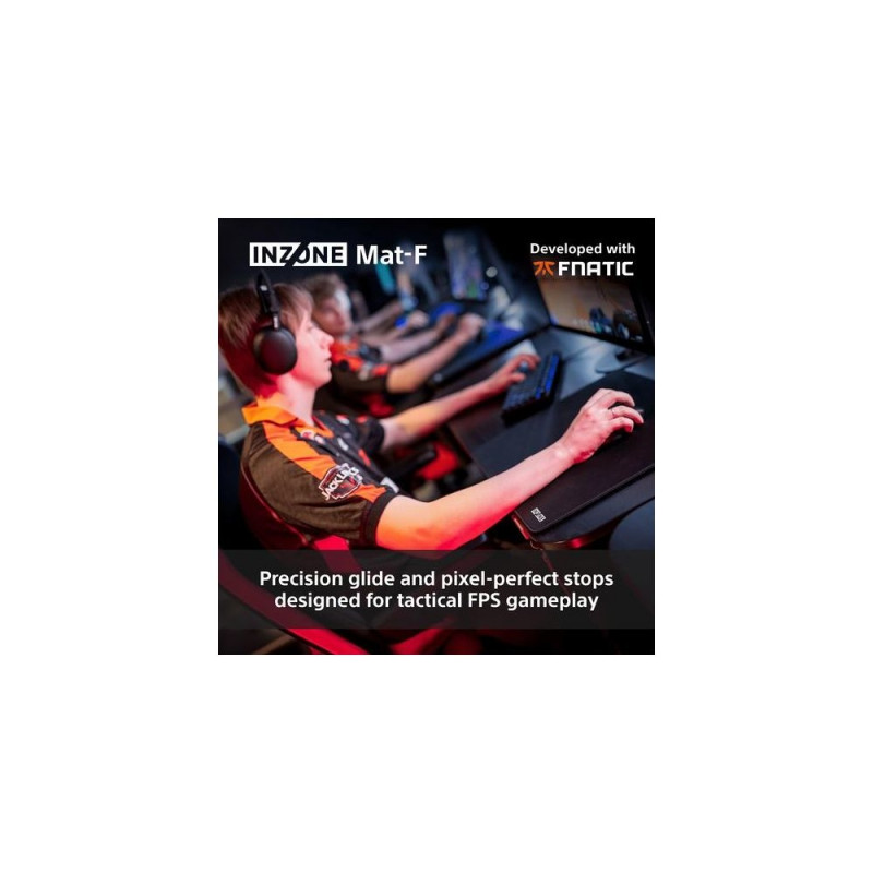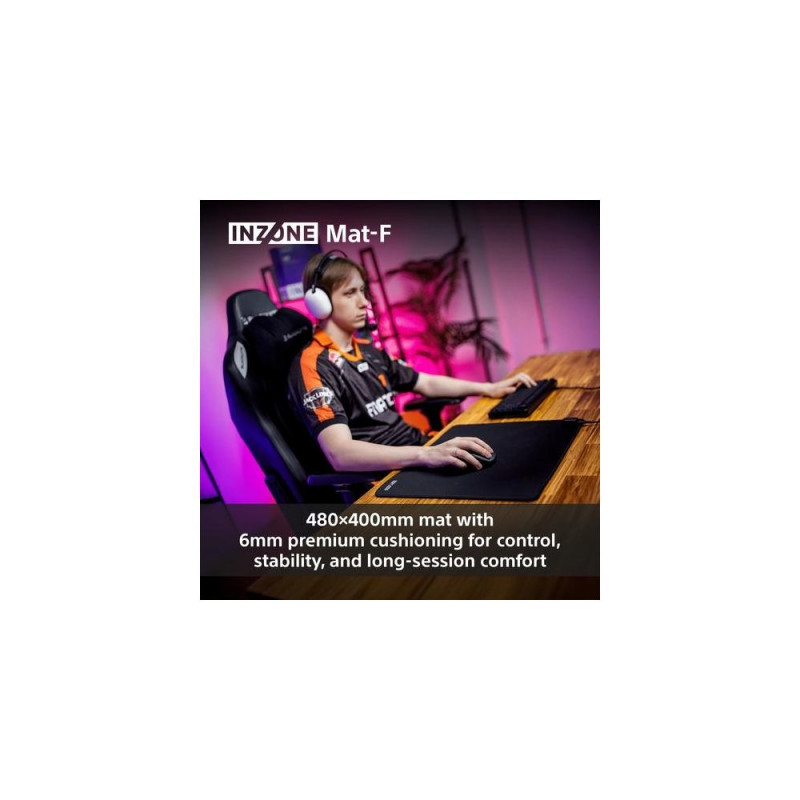 <b>6mm thickness. More stopping control</b><br>The 6mm thickness provides just enough resistance to support sharper aiming and smoother braking, ideal for low-sens players.<br><br><b>Glide light. Stop strong. With engineered fabric.</b><br>The textured fabric allows for easy micro-corrections, with enough friction to support hard stops. Tuned by Fnatic for both finesse and control.<br><br><b>Edge stitching that stays out of play</b><br>The stitch line sits below the surface, staying out of your way during gameplay. It’s reinforced to resist fraying and built for long-term durability.<br><br><b>Stable grip with SlimFlex backing</b><br>The SlimFlex back layer grips on the desk and resists curling, delivering a flat surface that stays in place, even during intense play.<br><br><b>Cushioned for wrist support</b><br>The 6mm base offers soft, even support to reduce wrist strain over long hours of play.<br><br><b>480x400mm. More space to move.</b><br>The mousepad is sized to support extended mouse travel, giving you more space.<br><br><br><br><br><br><br><br><br><br><br>Sony NZONE Mat-F. Width: 480 mm, Depth: 400 mm. Product colour: Black, Surface coloration: Monochromatic, Material: Polyester, Polyurethane, Stitched edges, Gaming mouse pad