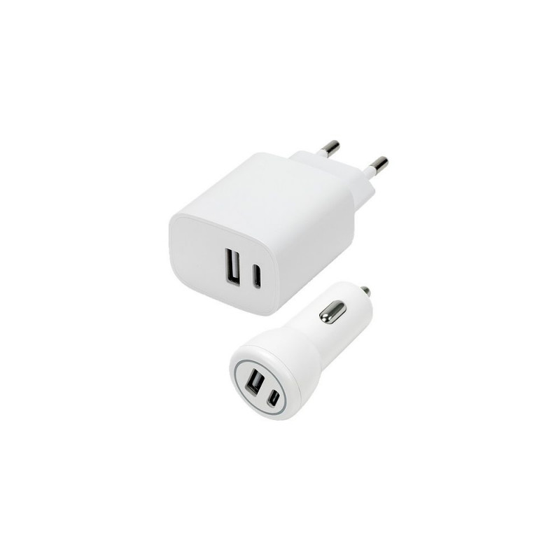 Wall & Car Charger Set USB-A & USB-C 15W, white