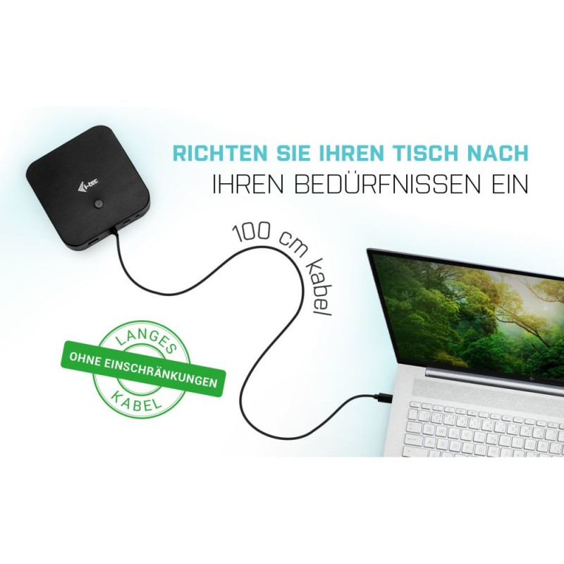 i-tec USB-C HDMI DP dokkimisjaam koos 100 W toiteedastusega. Ülekandetehnoloogia: kaabelühendus, host-liides: USB 3.2 Gen 1 (3.1 Gen 1) Type-C, USB-toiteallikas kuni: 100 W. Ethernet LAN andmeedastuskiirused: 10, 100, 1000 Mbit/s. Toote värvus: must, HD-tüüp: 4K Ultra HD, maksimaalne digitaalne eraldusvõime: 3840 x 2160 pikslit. Muude operatsioonisüsteemide tugi: Android. Laius: 113 mm, sügavus: 113 mm, kõrgus: 40 mm